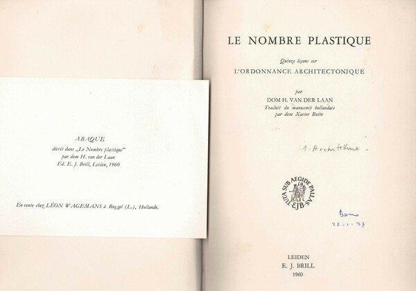 Orig cloth with golden lettering, 8vo, 135 pp. First edition. French text. Drawings by Van der Laan. Inserted illustration 'Abaque décrtit dans Le Nombre Plastique par dom H. van der Laan',rare. Orig cloth with golden lettering, 8vo, 135 pp. First edition. French text. Drawings by Van der Laan. Inserted illustration 'Abaque décrtit dans Le Nombre Plastique par dom H. van der Laan',rare. In 8° pp.135 prima edizione testo in francese.Disegni nel testo di Van der Laan,Raro. Codice articolo 26864
