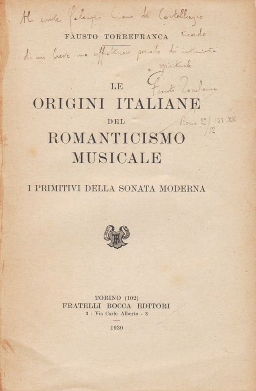 Plaquette In-8° (cm 24,5 x 16), brossura editoriale (allentata), pp. XV(1) e (2) all'inizio di bibliografia dell'autore. Al frontespizio bella dedica autografa firmata a Galeazzo Ciano. Si tratta di una rarissima plaquette di presentazione all'opera omonima, che sarebbe uscita lo stesso anno; vi si fala storia della composizione e delle tormentate vicende editoriali dell'importante saggio. Fausto TORREFRANCA, o Fausto Acanfora di Torrefranca (Vibo Valentia, 1883 - Roma, 1955), è stato un musicologo italiano. Si occupò di musicologia e fu un attivo propugnatore dell'attivazione dell'insegnamento di Storia della musica e di Estetica musicale nell'Università italiana. Docente di queste materie presso l'Università di Roma dal 1913 e presso l'Università Cattolica del Sacro Cuore di Milano dal 1930 al 1935, divenne professore ordinario a Firenze nel 1941. Fu inoltre bibliotecario presso il Conservatorio di Napoli e quello di Milano. Fu un convinto sostenitore della tradizione strumentale italiana sviluppatasi nel Cinquecento, nel Seicento e nel Settecento, trascurata successivamente a tutto vantaggio dell'opera lirica. Si devono a Torrefranca importanti contributi inerenti alla storia del quartetto, alla musica di Sammartini e alle origini della sonata. Di lui si ricorda, fra gli altri, un celebre saggio anti-pucciniano, pubblicato nel 1912: Giacomo Puccini e l'opera internazionale. Leonardo Pinzauti, che di Torrefranca fu assistente alla cattedra di Storia della musica negli anni Cinquanta, ricorda che nella vecchiaia Torrefranca parlava del suo Puccini come di 'un necessario peccato di gioventù' e affermava che, a suo giudizio, il suo libro aveva costretto Puccini ad una specie di autocritica, i cui risultati si sarebbero avvertiti nella raffinata strumentazione delle sue ultime opere, in particolare nel Trittico e nella Turandot.
