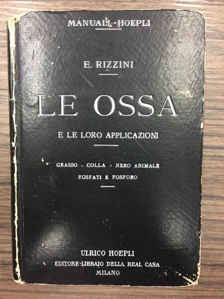 Grasso - Oggetti di osso - Fosfati d'ossa, … Milano. Hoepli 1923, 16°, pp. XV+257, con 69 incisioni. Timbro di biblioteca estinta. Leg. Edit. Con rottura al dorso e segni del tempo marginali.