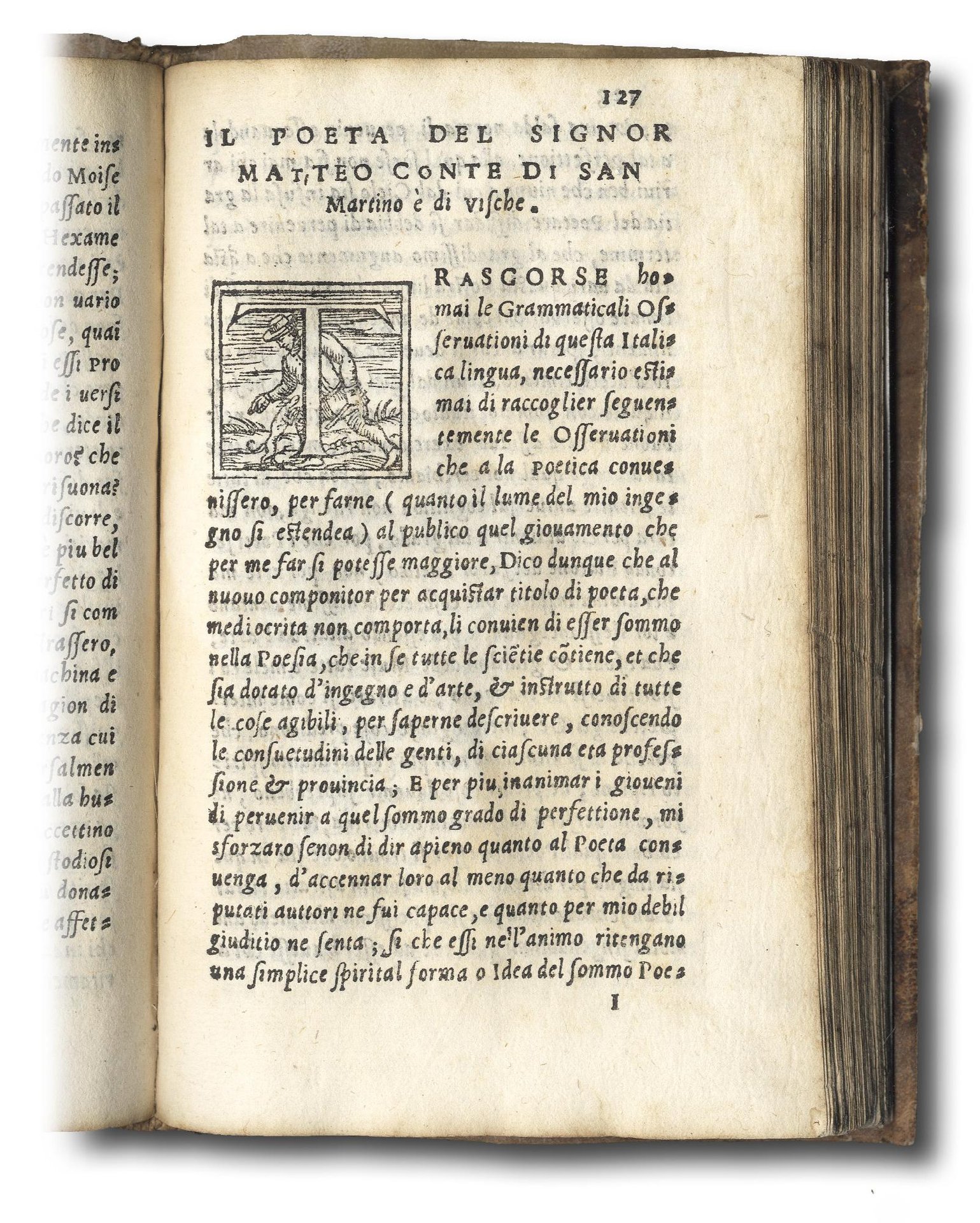 >in-8 (mm 150x100), pp. 245, (1) ma i.e. 247 perchè ripetute nella numerazione le p. 78-79) ricollocato in pergamena floscia dell'epoca (restauro al piatto anteriore), titolo mss. al dorso. Errata al verso dell'ultimo foglio. Al titolo due note di possesso “Federici ex marchionibus Clavessanae” e “Federici Gastaldi” e altre relative alle medesime provenienze al risguardo. Prima e unica edizione, dedicata al Cardinale Alessandro Farnese. Il conte canavesano Matteo San Martino di Vische (ca.1495-1556) fu inviato dal padre a Roma per migliorare la propria istruzione, fu amico del Bembo e del Marchese del Vasto. Scrisse anche una Pescatoria e delle Egloghe. (Vallauri, Storia della poesia in Piemonte I, p. 119-21). La scarsa notorietà di quest'opera grammaticale che si distacca dal purismo del toscano - e peraltro meritò la stampa da parte dei fratelli Dorico - è dovuta alla estrema rarità (3 esemplari censiti in Italia ed uno alla BNF). Soltanto in tempi recenti è stata oggetto di due saggi: uno a cura di Antonio Sorella (1999) e uno spagnolo (1996) "Italiano y piamontés en el siglo XVI". Del resto è singolare che un piemontese, per quanto colto e nobile, si sia dedicato così presto allo studio della pura lingua toscana. Buon esemplare, malgrado qualche alone ai due ultimi quaderni. Gamba 1634: "Anche questo scrittore, ch'era Piemontese, nella dedicazione si mostra alieno dal giurare in verba de' soli autori toscani... quando esse sieno accompagnate da assiduo studio, giovano a dar perfezione ad ogni scienza, più che il natal sito".