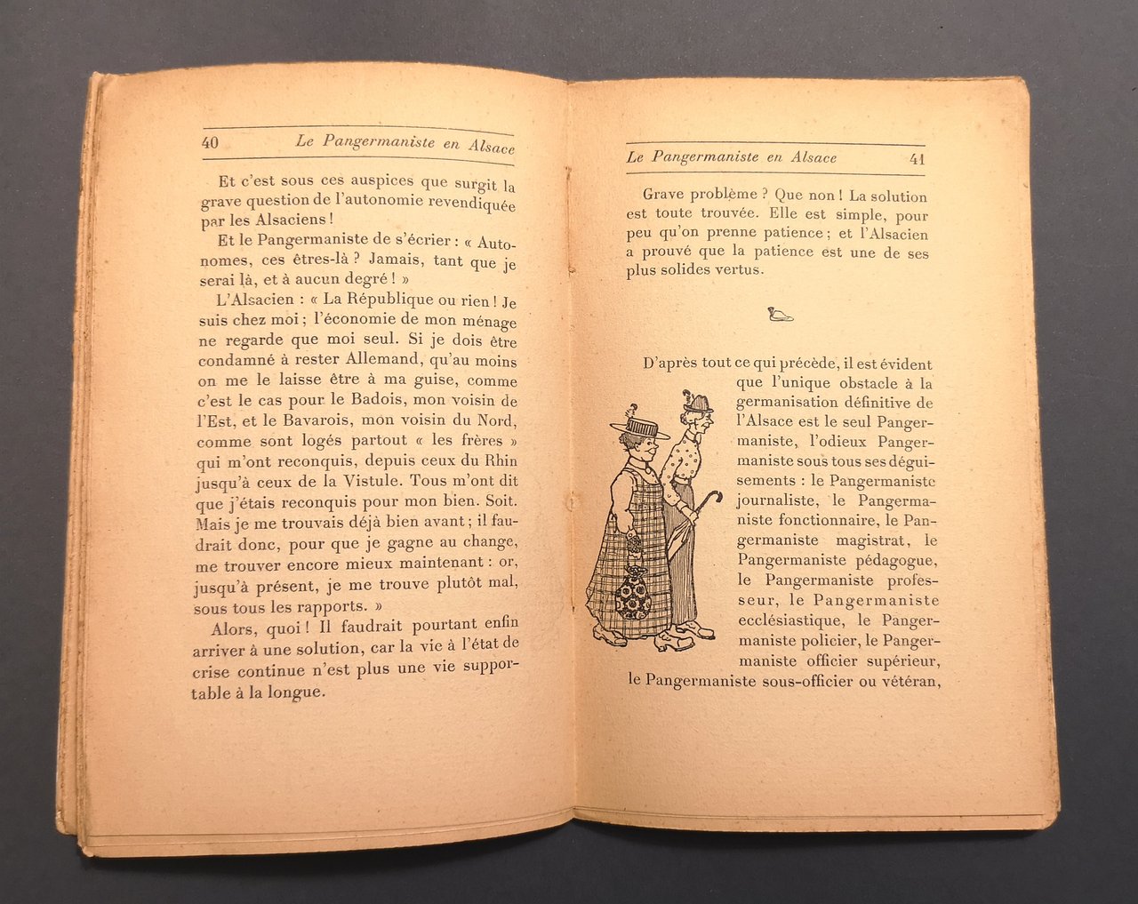 >in-16, pp. 77, (3) figurate da vignette in nero n.t.; broch. edit. figurata. L'opera è un divertente e vigoroso appello per l'Alsazia francese illustrato con 16 disegni di Hansi. Buon esemplare, ma bruniture alla coperta.