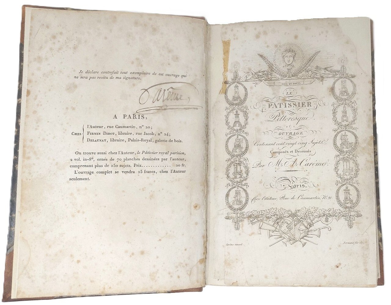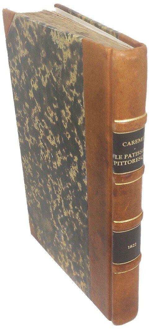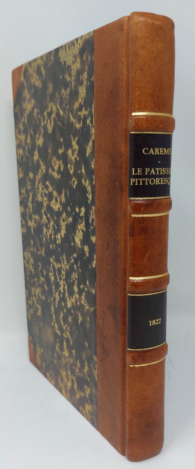 >In-8 (mm 234x147), pp. (2), 30 (di 32, mancano le ultime due pagine del testo). Frontespizio inciso, su disegno dello stesso Carême, in cornice di vignette, medaglioni e motivi antiquari, in alto il Dieu di Goût. 125 tavole realizzate da diversi incisori, sempre su disegno dell'Autore. Legatura moderna in mezza pelle con angoli, piatti ricoperti in carta decorata, al dorso titolo e data di stampa in oro. Seconda e rara edizione di questo magnifica opera del grande inventore della cucina francese, il capolavoro della cucina aristocratica dell'Ancien Régime. La prima edizione, apparsa nel 1815, è pressoché introvabile. Il principio che guidò Marie-Antoine Carême nella compilazione del Patissier Pittoresque è espresso in questa sua affermazione: "les beaux arts sont au nombre de cinq, à savoir: la peinture, la sculpture, la poésie, la musique et l'architecture, laquelle a pour branche principale la pâtisserie”. Affermazione che si traduce visivamente nelle 125 illustrazioni che corredano il volume, prevalentemente dedicate alle sue leggendarie pièces montées, complesse preparazioni di pasticceria di grandi dimensioni utilizzate come centrotavola, per le quali Carême traeva ispirazione da antichi libri di archictettura conservati nelle biblioteche parigine. Già al servizio di Charles Maurice de Talleyrand-Périgord e Napoleone, Carême fu in seguito chef de cuisine del principe reggente inglese, il futuro Giorgio IV, e in seguito dello zar Alessandro I. Prestigiosi anche gli ultimi anni della sua carriera, trascorsi a Parigi al servizio del banchiere James Mayer Rothschild. All'occhietto firma autografa di Carême, a garantire da possibili contraffazioni del volume. Esemplare discreto, con le mancanze dichiarate. Diffuse bruniture e fioriture; evidenti tracce d'uso. Ampia gora al margine interno; restaurati gli angoli esterni bianchi del frontepizio inciso.