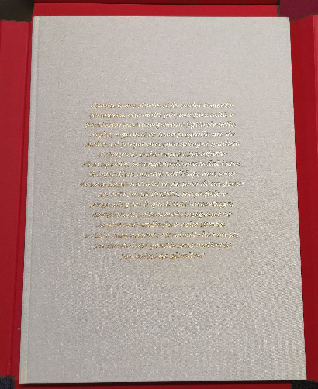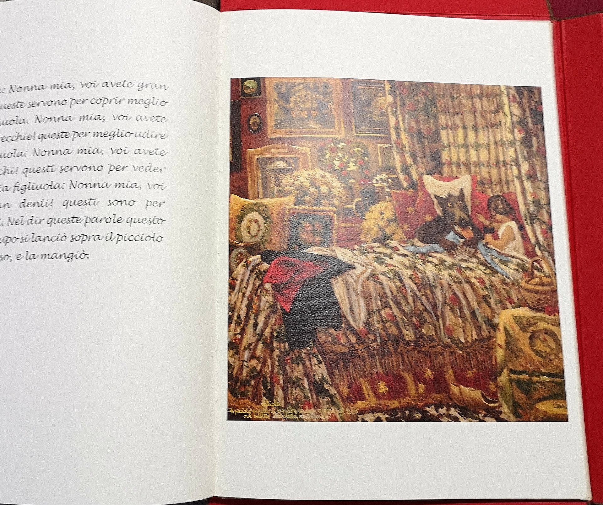>in-folio, ff. 33 n.n., tra cui 4 tavole dipinte a colori applicate e 1 tavola a colori ripiegata, leg. in t. tela editoriale grigia, scritte impresse in oro al piatto ant., entro cartella edit. Elegante edizione originale, impressa in 233 esemplari su carta forte, numerati (ns. 231) e firmati a mano da Saliola, che illustra magistralmente la nota favola di ''Cappuccetto Rosso'', nella versione originale del 1697 di Charles Perrault e dei F.lli Grimm del 1812. Con relative prime traduzioni in italiano e la versione aggiunta di Carlo Collodi. Presentazione di Antonio Faeti. Perfetto esemplare, con dedica autografa dell'editore al colophon.