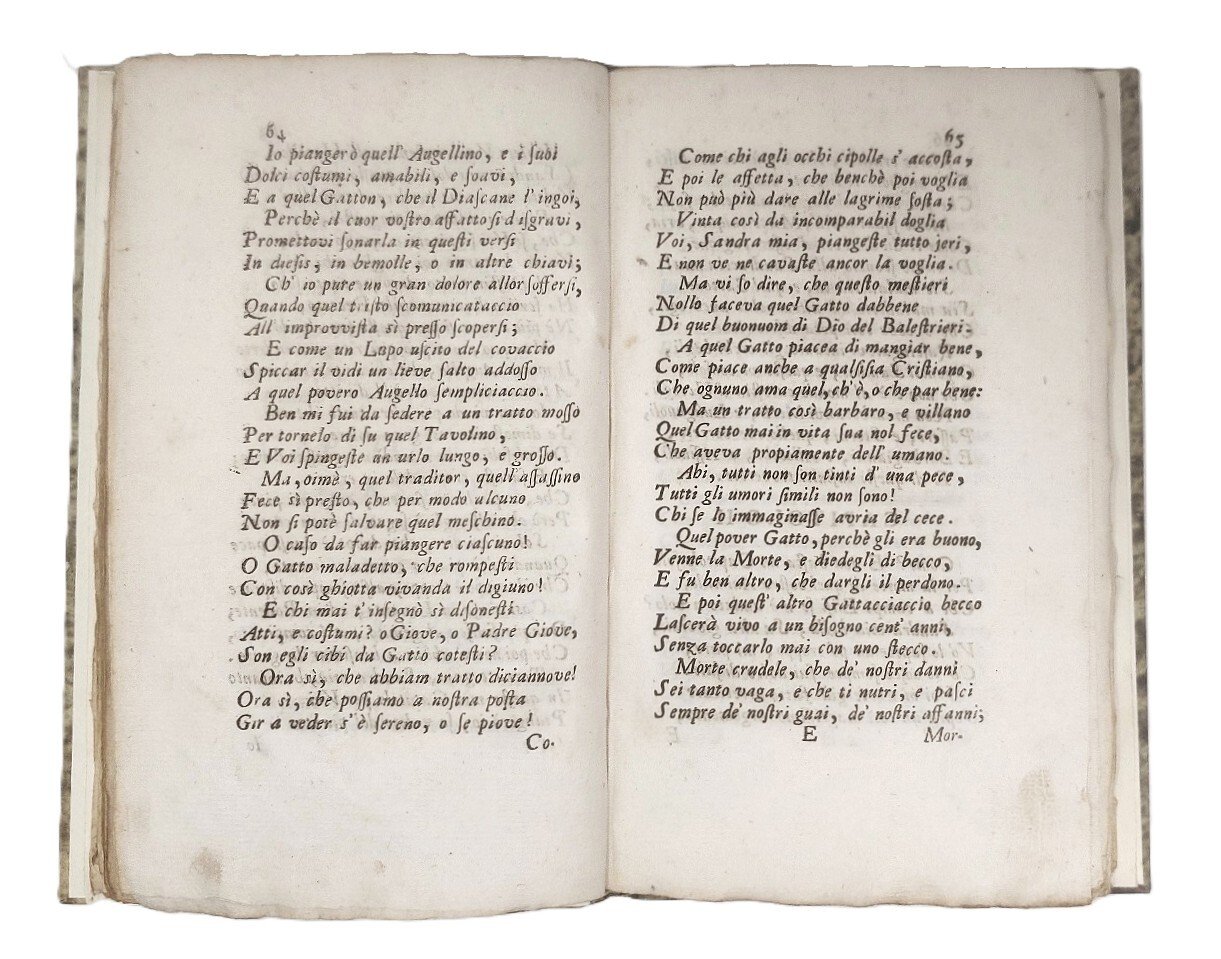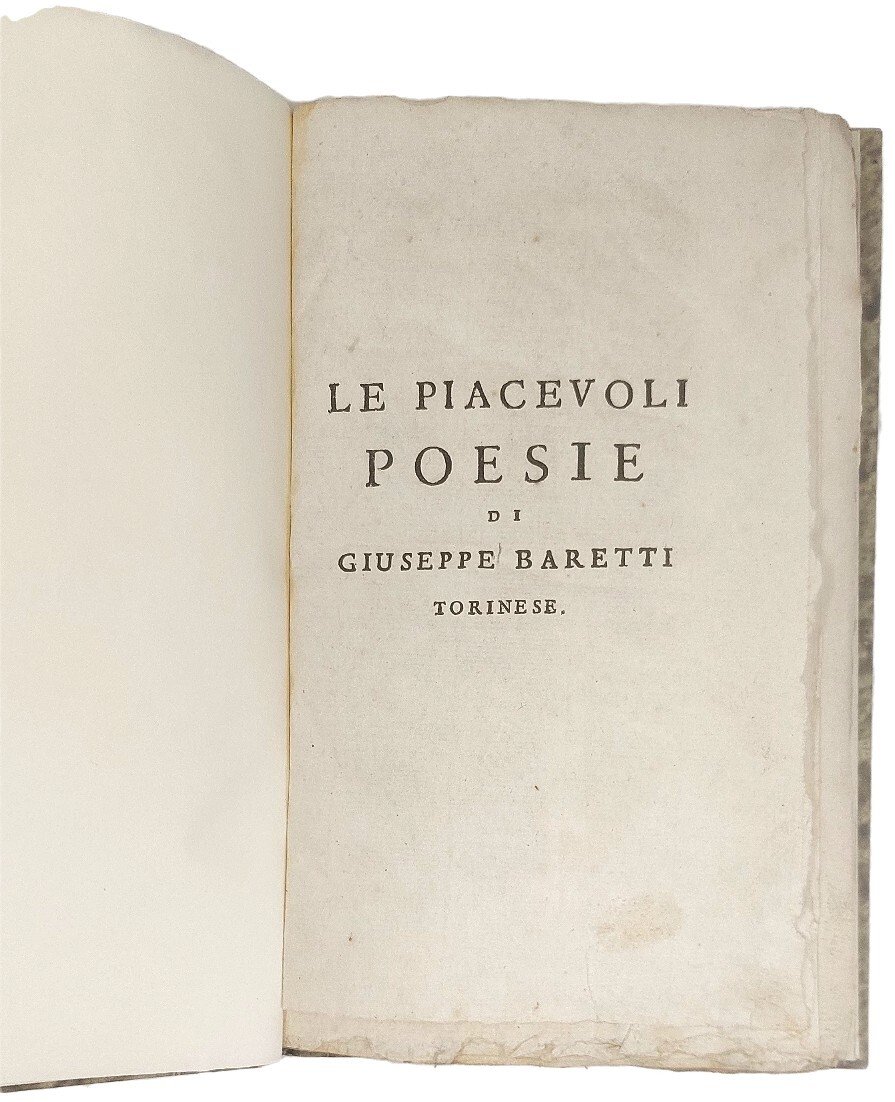 >in-8, pp. 160, bella leg. mod. cart. marmorizz. Prima edizione, molto rara. ''Sono 47 componimenti giocosi: capitoli, stanze, canzoni, sonetti'' (Piccioni); ma più che ''giocosi'', sono ''versi di tipo bernesco dove si esprimevano i suoi umori acri e dispettosi contro i suoi avversari'' (Diz. Bompiani, Autori, I, p. 175). Precede un proemio encomiastico di quattro stanze del conte Gaspare Gozzi. Esempl. puro, a fogli disuguali, a pieni margini, con barbe. Piccioni n. 8.