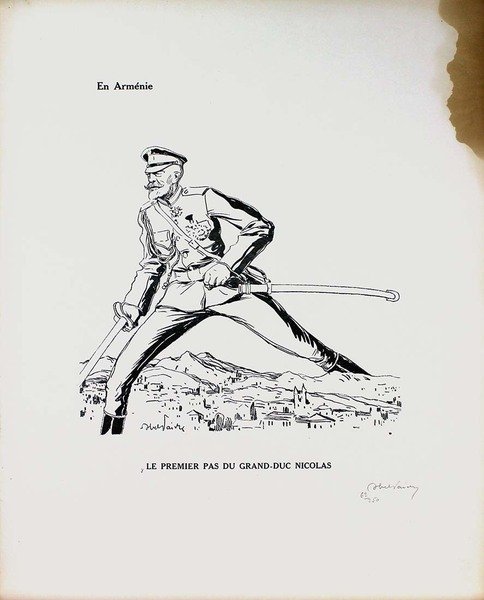 Abel Jules Faivre (Lione 1867 - Nizza 1945) Litografia originale firmata a mano dall'artista.Dimensioni: 56 x 38,5 cmCon certificato di autenticità C.O.A.Ingiallimento laterale come da foto.Esemplare numero 62/250 La raccolta di litografie umoristiche del caricaturista francese Abel Faivre (Lione 1867-Nizza 1945), andata a confluire nel volume Jours de guerre,fu pubblicata in due tomi tra il 1915 e il 1919. Con il procedere del conflitto, l'opinione pubblica di tutti i paesi coinvolti,che aveva dapprima affrontato tale evento con ottimismo, mutò rapidamente opinione sino a considerare la guerra, senza mezzi termini,come un avvenimento rovinoso. In tale contesto, le vignette satiriche di guerra possedevano un potente effetto catartico,adempivano un ruolo sociale irrinunciabile, fornendo una valvola di sfogo all’incombere dal più cupo pessimismo. Abel Jules Faivre (Lyon 1867 - Nizza 1945) Originale Lithographie vom Künstler von Hand signiert.Abmessungen: 56 x 38,5 cmMit Echtheitszertifikat C.O.A.Seitliche Vergilbung wie auf dem Foto.Kopieren Sie die Nummer 62/250 Die Sammlung humorvoller Lithographien des französischen Karikaturisten Abel Faivre (Lyon 1867-Nizza 1945), die in den Band Jours de guerre floss,es wurde zwischen 1915 und 1919 in zwei Bänden veröffentlicht. Im Verlauf des Konflikts wurde die öffentliche Meinung in allen beteiligten LändernWer dieses Ereignis anfangs mit Optimismus konfrontiert hatte, änderte schnell seine Meinung, um den Krieg ohne Zweifel zu betrachten.wie ein ruinöses Ereignis. In diesem Zusammenhang hatten die satirischen Kriegskarikaturen eine starke kathartische Wirkung.Sie erfüllten eine unverzichtbare soziale Rolle und bildeten ein Entlastungsventil gegen den dunkelsten Pessimismus. Abel Jules Faivre (Lyon 1867 - Nice 1945) Lithographie originale signée à la main par l'artiste.Dimensions: 56 x 38,5 cmAvec certificat d'authenticité C.O.A.Jaunissement latéral comme sur la photo.Copie numéro 62/250 La collection de lithographies humoristiques du caricaturiste français Abel Faivre (Lyon 1867-Nice 1945), qui allait se fondre dans le volume Jours de guerre,il a été publié en deux volumes entre 1915 et 1919. À mesure que le conflit progressait, l'opinion publique de tous les pays impliqués,qui avait d'abord fait face à cet événement avec optimisme, a rapidement changé d'avis pour envisager la guerre, en termes non équivoques,comme un événement ruineux. Dans ce contexte, les caricatures de guerre satiriques ont eu un puissant effet cathartique,ils remplissaient un rôle social indispensable, fournissant une soupape de décharge du pessimisme le plus sombre. Abel Jules Faivre (Lyon 1867 - Nice 1945) Original lithograph signed by hand by the artist.Dimensions: 56 x 38.5 cmWith certificate of authenticity C.O.A.Lateral yellowing as in the photo.Copy number 62/250 The collection of humorous lithographs by the French caricaturist Abel Faivre (Lyon 1867-Nice 1945), which went to flow into the volume Jours de guerre,it was published in two volumes between 1915 and 1919. As the conflict progressed, public opinion in all the countries involved,who had initially faced this event with optimism, quickly changed his opinion to consider the war, in no uncertain terms,like a ruinous event. In this context, the satirical war cartoons had a powerful cathartic effect,they fulfilled an indispensable social role, providing a relief valve from the darkest pessimism.