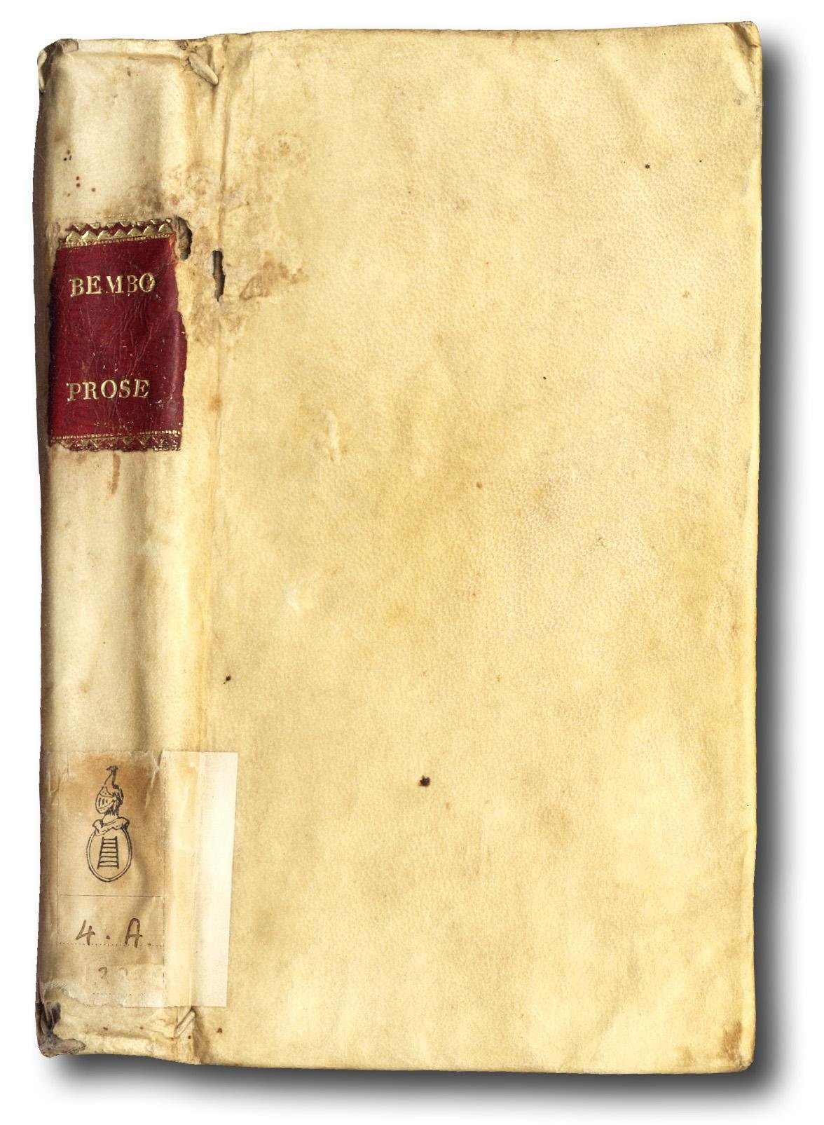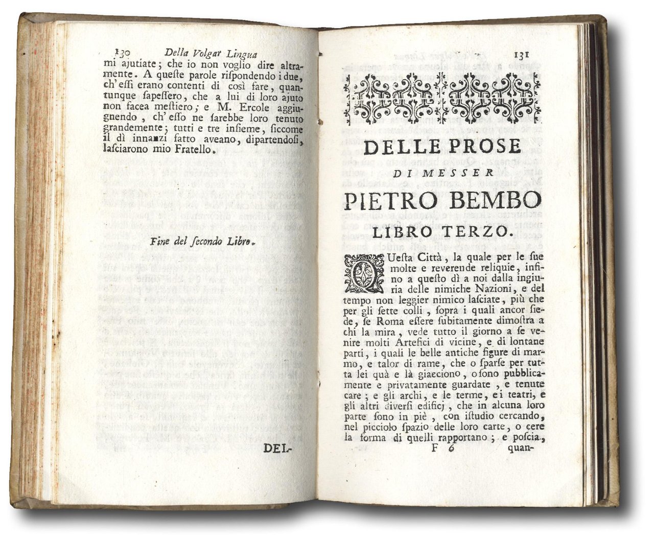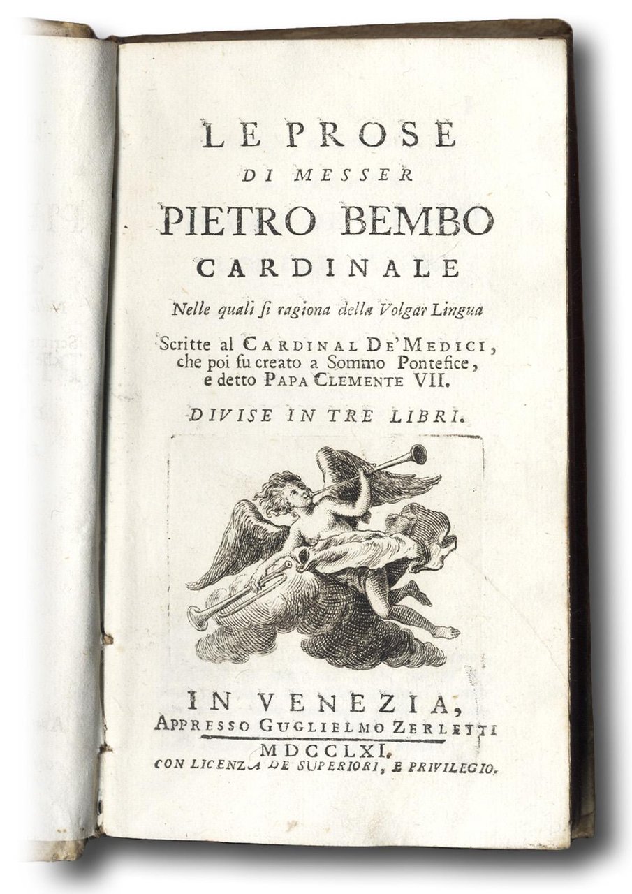 >in-12, pp. 312, legatura coeva p. perg. Impresa tipogr. inc. sul tit. Precede la dedica di Benedetto Varchi a Cosimo de' Medici datata 1548. Graziosa edizione di questo celebre trattatello (apparso per la prima volta nel 1525) in difesa della lingua volgare dei tre grandi scrittori toscani (Dante, Petrarca e Boccaccio), con precetti sullo stile, sulle forme metriche, sulla grammatica, ecc. Bell'esempl., con ex-libris L. Scalia.