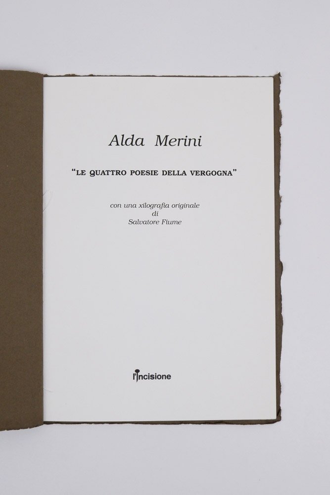 “Le quattro poesie della vergogna”. Con una xilografia originale di Salvatore Fiume | Rare and modern books | Merini, Alda [Fiume, Salvatore (Copertina Di)]