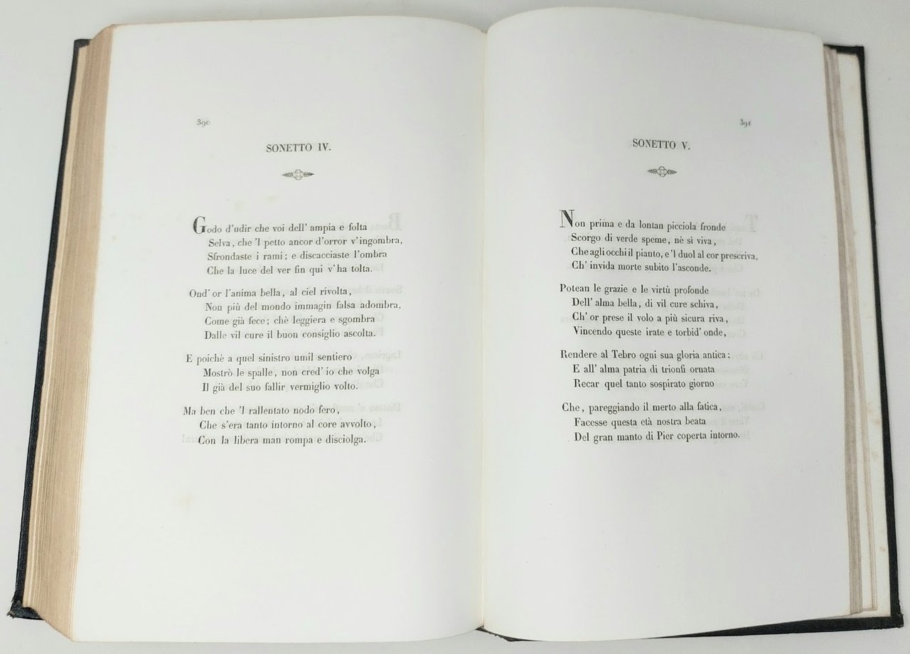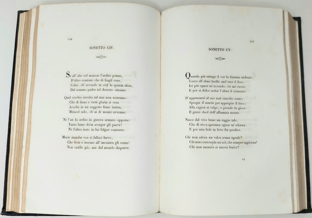 >in-8 gr. (260x170 mm), pp. CLIV, 472, tre tavole incise f.t. (ritratto di Vittoria C. e due tavole di medaglie). Sontuosa legatura d'edizione in marocchino blu decorata a secco ed in oro al dorso e sui piatti, al centro dei quali sono impresse le armi araldiche delle famiglie Colonna e Torlonia, tagli dorati. Bellissima edizione impressa in ristretto numero di copie per le nozze di Teresa Colonna con Alessandro Torlonia: ogni foglio è di carta filigranata con le armi degli sposi. E' la migliore e più completa raccolta di rime della notissima poetessa (1490-1547). Esemplare di notevole freschezza, splendido, nell'artistica legatura originale.