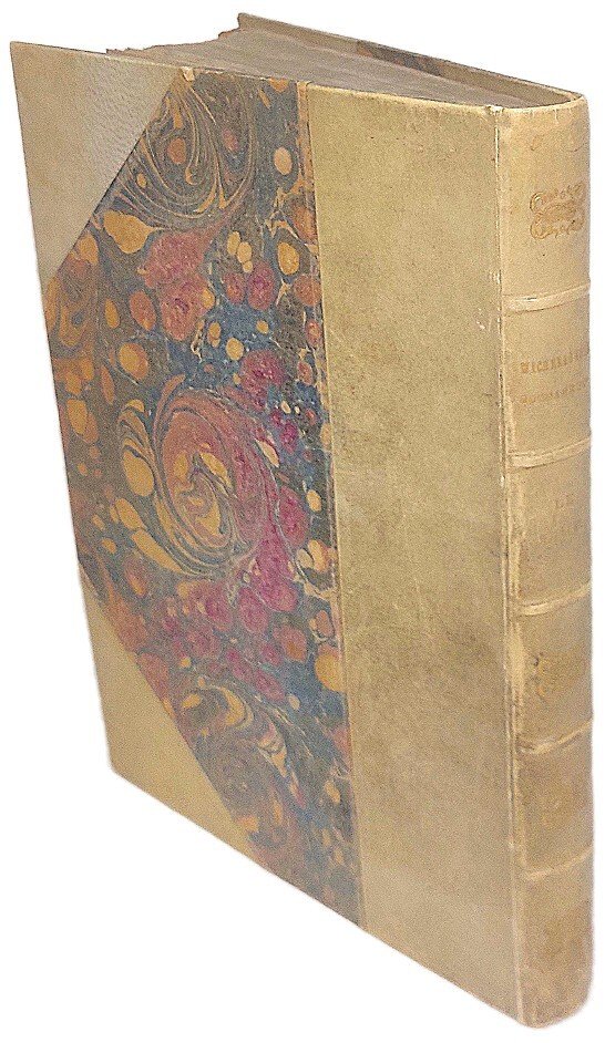 >in-4 picc., pp. (4), XVI, 264, (2), attraente legatura coeva in mezza pergamena ed angoli, dorso a nervi con titolo e fregi oro. Impresa tipografica dell'Accademia della Crusca, ripetuta varie volte, numerosi finalini silogr. Bella ed accurata edizione di Crusca, in parte originale ("Rime inedite" alle pp. 247-258), su carta forte con barbe. «E' ricopiata l'edizione 1726, e sono al fine Rime inedite tolte da un Codice Vaticano. L'editore anonimo è stato Alessandro Maggiori, nato in Fermo nel 1764 e morto nel 1834, il quale ciò che nelle Rime del Buonarroti v'ha di bello, di elevato, di storico si occupò a dichiarare con annotazioni» (Gamba). Ottimo esemplare, a pieni margini. Gamba, Testi di Lingua, n.250.