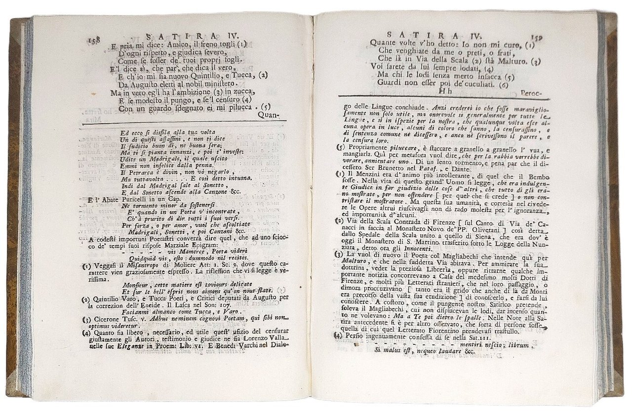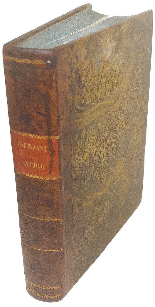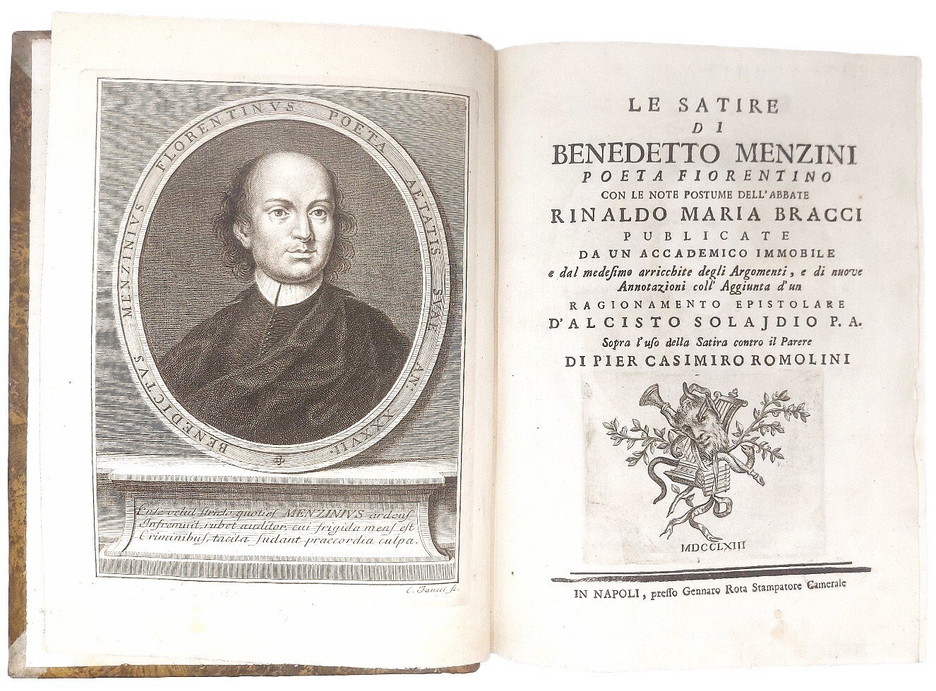 >in-4, pp. (4, le prime 2 bb.), LXXXII, 465, legatura coeva in mezza pelle, titolo e fregi oro al dorso. In antiporta bel ritratto dell'autore in ovale inciso in rame da C. Faucci, impresa tipografica sul titolo. Ottima edizione critica (la prima era apparsa postuma nel 1718 ad Amsterdam) delle dodici satire del Menzini (Firenze 1646 - Roma 1704, sacerdote, illustre poeta e letterato) che sferzano la società toscana, o meglio fiorentina, specie le classi colte, l'aristocrazia, la borghesia, il clero e la Corte di Cosimo III. Sotto il nome arcadico di "Accademico Immobile", editore del volume ed autore degli Argomenti e dell'Appendice (p. 373), si nasconde il marchese Guasco di Alessandria, mentre suo fratello Franc. Eugenio è autore del "Ragionamento di Alcisto Solaidio". Bell'esemplare, a pieni margini. Gamba 669: «Edizione tenuta in stima per le varie lezioni aggiuntevi, e tolte da un testo a penna». Cian, La satira, II, pp. 231 e seg.