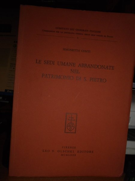 Simonetta, Conti. Firenze, Leo S. Olschki Editore, MCMLXXX. Le Sedi umane abbandonate nel patrimonio di S. Pietro. In-8°, cart. edit. 195 pp. con quattro tavole fuori testo e illustrazioni nel testo. Esemplare in ottimo stato di conservazione (intonso) con timbro di ex Libris nella prima bianca. Neg. Bol. mob. 20 entro busta trasp.