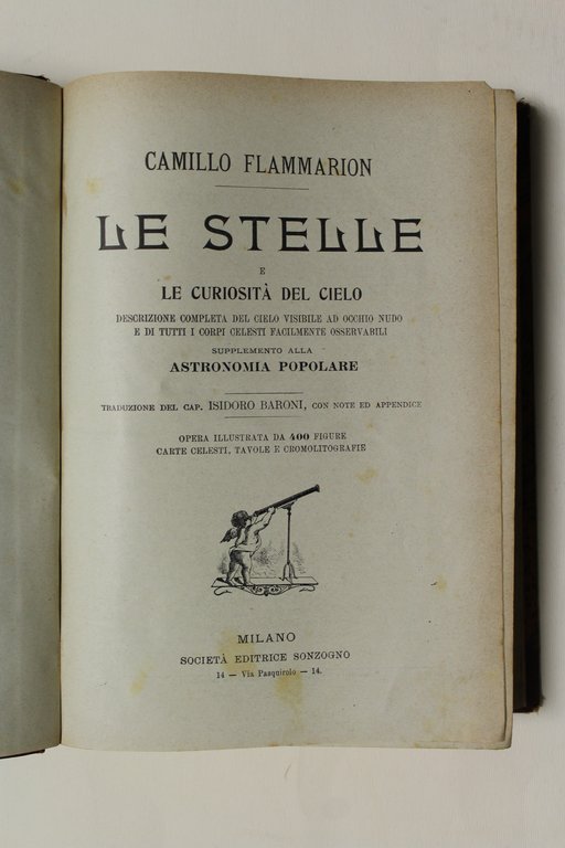 Le stelle e le curiosità del cielo, descrizione completa del cielo visibile ad occhio nudo e di tutti i corpi celesti facilmente osservabili. Traduzione del Cap. Isidoro Baroni. Opera illustrata da 400 figure, carte celesti, tavole e cromolitografie