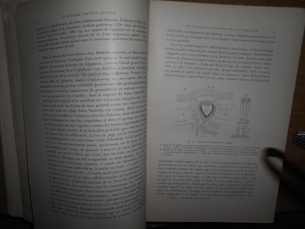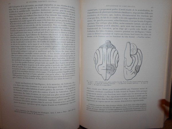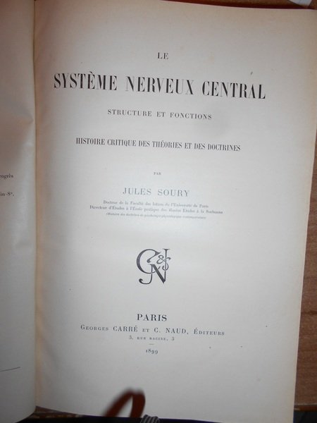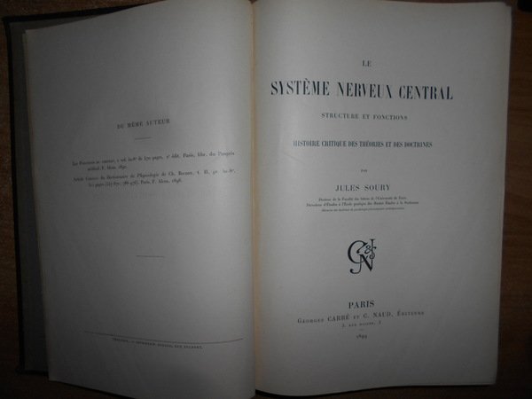 JULES, SOURY. Paris, Georges Carré et G. Naud, 1899. Le système nerveux central, structures et fonctions, histoire critique des Théories et des Doctrines. Edizione originale. 2 volumi in-8°, tela coeva edit. con fregi e titoli in oro sui piani e ai dorsi. Complessive X, 1863, (4) pp. con numerose illustrazioni nel testo. Questa monumentale storia di anatomia e fisiologia del sistema nervoso fu incoronata nel 1900 dall'Accademia delle Scienze e dall'Accademia della Medicina. Ottimo esemplare in prima edizione. "Storia massiccia dell'anatomia e della fisiologia del sistema nervoso dall'antica Grecia alla fine del 19 ° secolo, limitata nella sua analisi storica. Il secondo volume è un sondaggio delle opinioni di fine 19 ° secolo sulla struttura e la funzione del nervoso sistema ". Uff. C - IV - 5