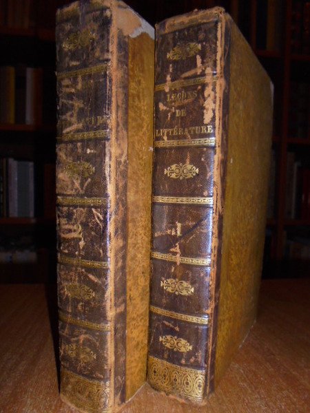 Par M. Noël. Paris, chez Le Normant Père, Libraire, 1823. Leçons Françaises de Littérature et de Morale, ou recueil, en prose et en vers, des plus beaux Morceaux de notre Langue dans la Littérature des deux derniers siècles; avec des préceptes de genre, et des modèles d' exercice, par La Harpe, Marmontel, Maury, Le Batteux, etc. Douzième edition. Due volumi in - 8°, m. pelle coeva, titolo e fregi in oro al dorso. xxiv, 707 pp.; 679 pp. Esemplare ben conservato.