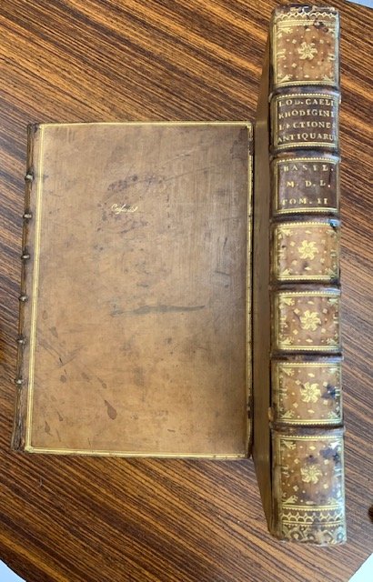 >2 vol. in-folio (320x220), pp. (252), 1182, (2), numeraz. continuata; bel carattere tondo e corsivo; bella leg. del XVIII sec. in p. vitello avana con tit. e fregi oro sui dorsi, riquadri oro sui piatti, pizzo int., tagli dor. Marca tipogr. sul frontesp., ripetuta in fine; grandi e piccole iniz. stor. ed ornate su fondo ''criblé''. Esempl. ''règlé'' ad ogni pagina con filettature d' inchiostro bruno. Stimata edizione di quest'immenso ''zibaldone'', monumento di erudizione, in cui l'autore ( Luigi Ricchieri, filologo ed umanista di Rovigo,1469-1525) raccolse i frutti delle sue innumerevoli letture e le sue osservazioni sui testi studiati e commentati durante i lunghi anni d'insegnamento nella città natale, in varie città dell'Emilia e del Veneto ed a Milano, dove fu bene accolto e stimato dal governatore Grollier, cui dedicò quest'opera. Oltre la miriade d'informazioni filologiche ed archeologiche, vi si trovano 10 capitoli relativi alla musica dei Greci e dei Romani. «Ce recueil s'étend...toutes les branches des connaissances humaines; mais l'auteur s'attache principalement...discuter le sens philologique des innombrables passages d'écrivains anciens qu'il a extraits...» (Hoefer, NBG XLII, 134). Magnifico esempl.internamente, in bella legatura con qualche abrasione, restauri agli spigoli ed alle cuffie, cerniere deboli. STC, German Books, 740. Adams, R-452.