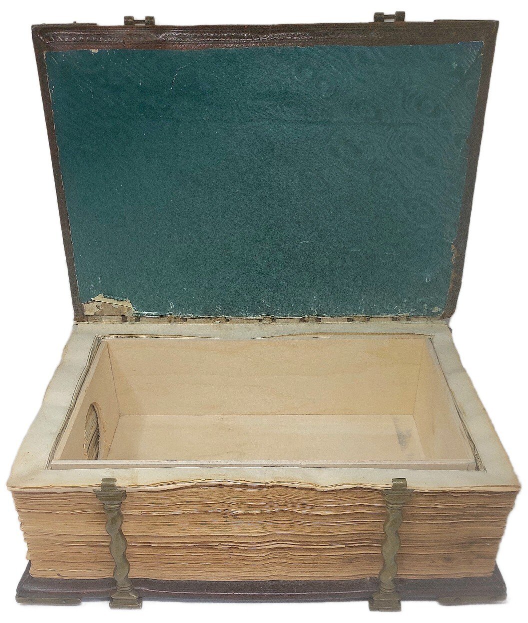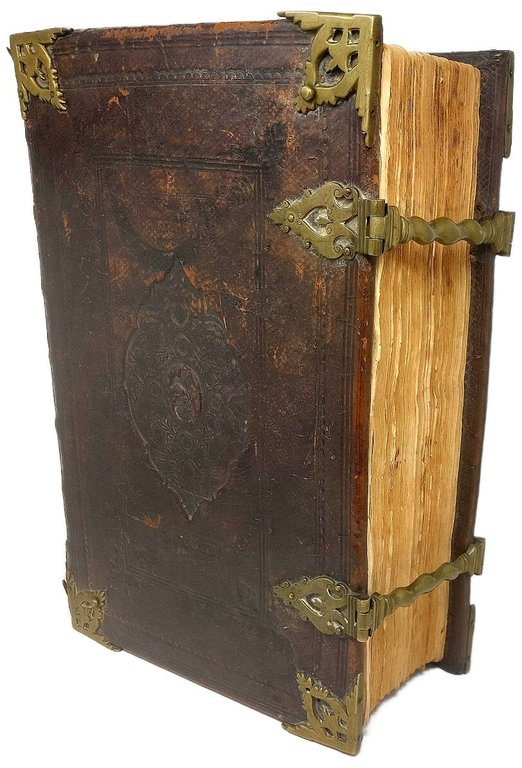 >Legatura coeva di grande formato (450x300x145mm), piena pelle su assicelle con elementi angolari e fermagli di chiusura in ottone, riccamente impressa a secco.Al centro dei piatti un grande fleuron di gusto arabeggiante, con all'estremo superiore le lettere IC-IAHN ed inferiore la data MDCCXXVI e le iniziali BS, il tutto incorniciato da triplice filetto, motivi floreali accantonati ai 4 angoli, il tutto racchiuso entro cornice..Elaborate decorazioni metalliche realizzate in ottone ai 4 angoli superiori ed inferiori, antichi fermagli di chiusura perfettamente conservati e funzionanti. “Faux livre ou livre à secret” del XVIII secolo, nascondiglio per gioielli, epistolari o piccoli segreti. La parte esterna del volume si presenta come un libro normale, internamente il volume è stato scavato e nella parte centrale è stato inserito un vano ligneo, sono stati conservati solo i margini esterni bianchi.Legatura ben conservata, difetti e mancanze alle cuffie.