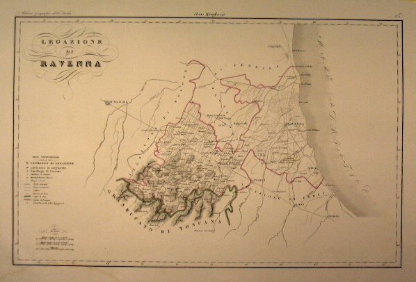 Tratto da ' Atlante geografico dell'Italia ' - Stato Pontificio - cm 33 x 51 - - Carta in buono stato di conservazione. - Leggere macchie al margine del foglio. - Tavola N. 5. Dimensione del foglio 470 mm x 630 mm. Confine di Stato e di provincia acquerellato.