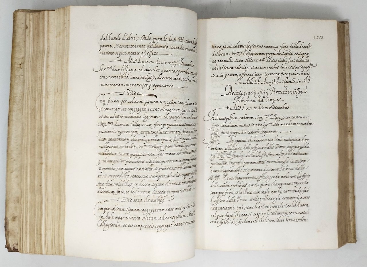>in-folio (mm 359x250), legatura coeva piena pergamena rigida, titolo ms. su dorso a nervi. Insieme di statuti genovesi manoscritti inframezzati da edizione a stampa, l'opera è così composta: (manoscritto) ff. 7 nn. di indici, ff. 10 num; (edizione a stampa) ff. 50 num. (le cc. 45 e 46 manoscritte); (manoscritto) ff. 340 num., alcuni ff. bianchi qua e là. F. 1 nn: "MDLXXXXVII in Genova. Genuensis Reip. Leges Anni 1576 una cum Legislatorum auctoritate ac decretis deliberationibusq. omnibus praesertim in materia Legum ac Statutorum inde ac per totum Annum 1590. In unumq. collectis ad usum Julii Pallavicini quon. Ill. mi Domini Augustini". Comprende varie approvazioni e concessioni del 1575 (ff. A-L); le Leges Novae dell'ediz. a stampa del 1576 (ff. 1-50), con relative interpretazioni, e numerose aggiunte redatte dal 1577 al 1590. Bella e chiara scrittura corsiva di unica mano. Ottima conservazione. Raccolta legislativa di grande interesse, comprendente vari ordini, decreti e disposizioni, seguite da una serie di deliberazioni dei Consigli Maggiore e Minore che portarono aggiunte e modifiche alle leggi vigenti. Particolarmente importanti i documenti in volgare ai ff. A-F che narrano di come si svolse il procedimento legale per giungere alle famose Leges Novae. Manoscritto analogo a quello descrittto dal Cat. del Senato, vol. III, pag. 290, impreziosito dall'aggiunta dell'ediz. a stampa. Buon esemplare. Cat. Senato, III, 2868. Manno, VI, 25307. Manzoni, I, 211. Fontana, II, 19.