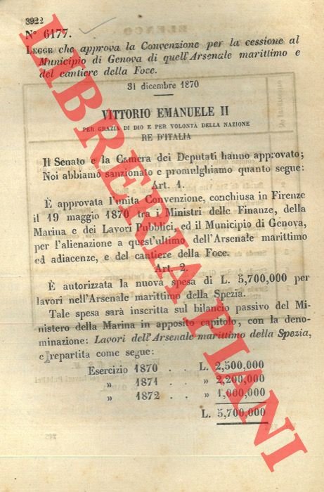 Legge che approva la Convenzione per la cessione al Municipio di Genova di quell'Arsenale marittimo del cantiere della Foce.