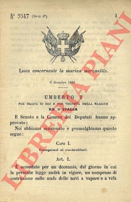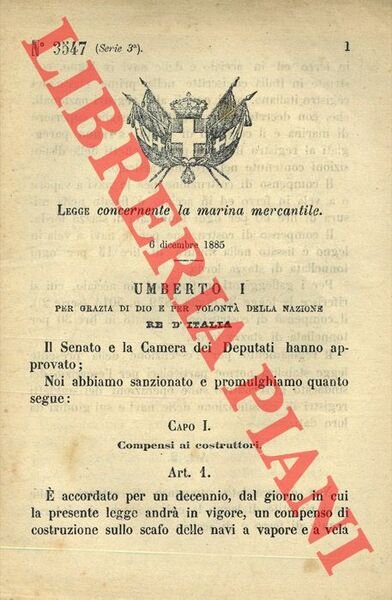 Roma nella Reale Tipografia, 1885, dicembre 6, a firma Umberto I, B.Brin, A.Magliani, B.Grimaldi, C.Robilant, pp. 32
