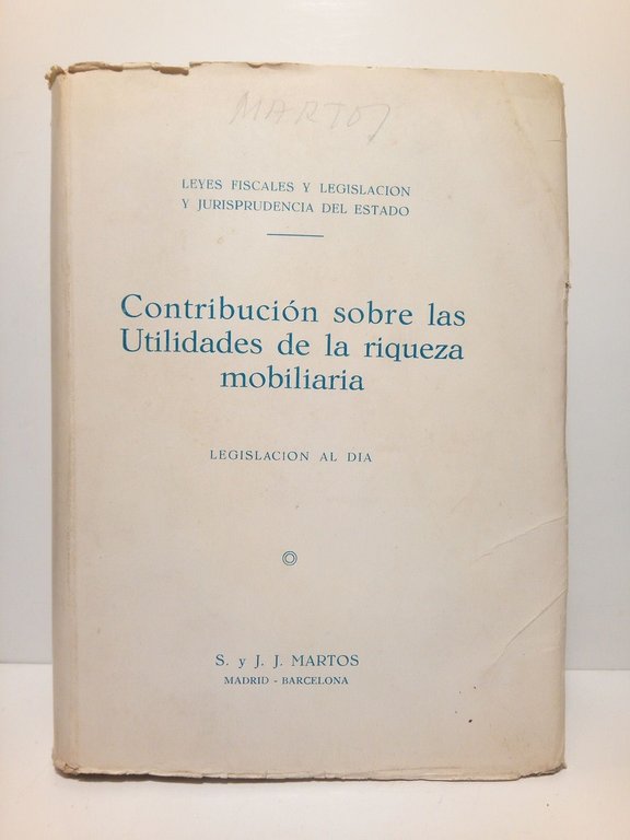 Legislación reguladora de la contribución sobre las utilidades de la riqueza mobiliaria / Refundición y anotaciones en el texto de 22 de septiembre de 1922, realizada por Salvador y José Martos; con la colaboración técnica de Licenciados en Derecho y Ciencias Económicas y otros profesionales titulados