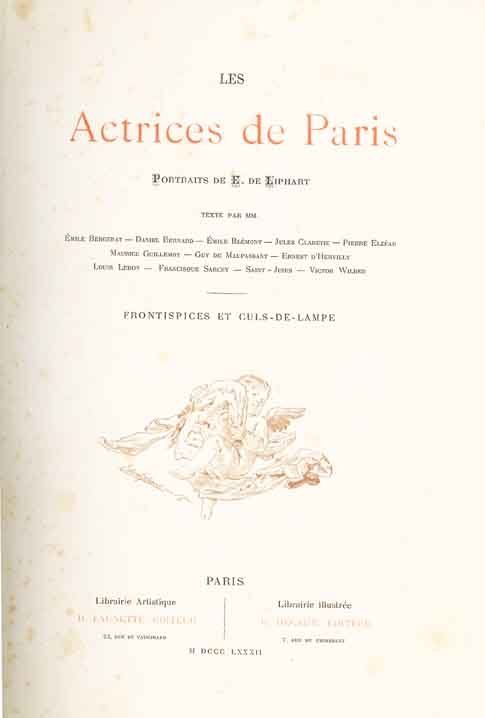 Les actrices de Paris. Portraits de E. de Liphart. Texte par mm. Émile Bergerat, Daniel Bernard, Emile Blémont, Jules Claretie, Pierre Elzéar, Maurice Guillemot, Guy de Maupassant, Ernest d'Hervilly, Louis Leroy, Francisque Sarcey, Saint-Juirs, Victor Wilder