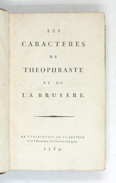 (4), 481, (1) SS. Halblederband der Zeit mit goldgepr. Rückenschildchen und -fileten. Dreiseitig marmorierter Farbschnitt. 8vo. Hübsche und seltene französische Ausgabe der Theophrastischen Charaktere in La Bruyeres Übersetzung und wirkungsgeschichtlich bedeutender Erweiterung. "Das an La Rochefoucauld geschulte, in anschaulichem und klassischem Stil abgefaßte Werk erreichte noch im Erscheinungsjahr drei Auflagen. Von einer Auflage zur anderen fügte La B. neue Portraits, Maximes und Réflexions hinzu; in die achte Auflage nahm er auch die anläßlich seiner Wahl in die Académie Francaise gehaltene Rede auf. Diese letzte Ausgabe seines Lebens enthielt statt der anfänglichen 386 Charaktere schließlich 1118, hinter denen man zeitgenössische Personen der höheren Gesellschaft suchte und gefunden zu haben glaubte. An den Anfang seines Werkes stellte er eine Übersetzung des Theophrast, um dann athenische und zeitgenössische Sitten mit scharfer Satire und Groll gegen den Hof zu vergleichen" (Bautz, BBKL IV, 919). - Gutes, sauberes Exemplar.