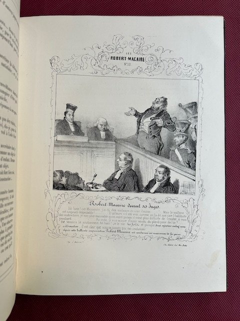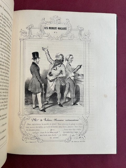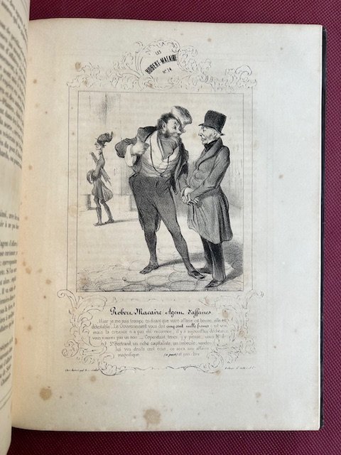 Due voll. in-4° (270 x 225 mm.), pp. 202 n.n. 101 tavv. litografiche a piena pagina di Daumier, belle ed elaganti legature in mezza pelle, titolo e fregi in oro al dorso, ai piatti ricco rosone a motivi arabeggianti. Robert Macaire è in origine un personaggio da melodramma a cui Frédérick Lemaître ha dato vita in 'l’Auberge des Adrets', opera teatrale di Benjamin Antier. È un bandito, un cinico imbroglione degli inizi dell'era industriale di cui Philippon e Daumier si impadroniscono. Essi lo trasformano in eroe con una serie di 100 litografie, edita dal 1836 al 1837, in una raccolta di racconti intitolati 'Cent et un' [Cento e uno]. Questa lunga serie inaugura la caricatura di costume e descrive i diversi atti della 'Commedia umana'. Che sia finanziere, politico, avvocato, giornalista, il Robert Macaire di Daumier è un individuo ipocrita e perfido che approfitta del sistema e sfida la morale: il tipo stesso dell'opportunista sempre pronto ad afferrare la migliore occasione per trarre profitto. Benefattore dalla postura pontificante e rispettabile, pingue e intrallazzatore è accompagnato dallo scheletrico Bertrand.
