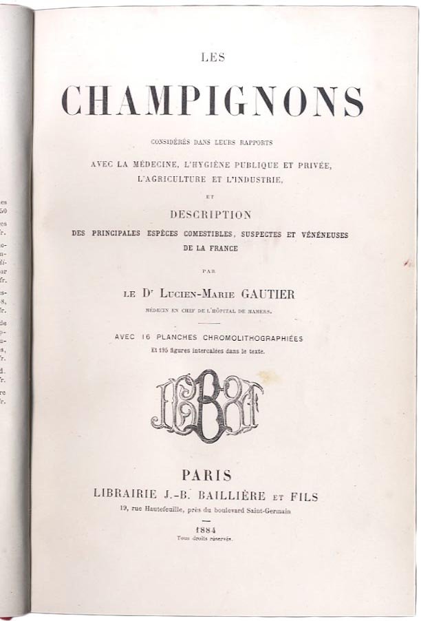 >in-8, pp. XVI, 508 illustrate da 195 figure in nero n.t., 16 tavole in cromolitografia impresse su carta forte; leg. In p. tela rossa, titolo e filetti in oro su tassello in pelle al dorso. Edizione originale di interessante opera illustrata, dedicata ad ogni aspetto dei funghi champignons, loro descrizione e catalogazione, proprietà nutritive, coltivazione ecc. Buon esemplare (macchioline di umido al frontespizio). Kelly p. 88; Schliemann 611; Volbracht 701; Lindau, G. Sydow, P. 526,56.