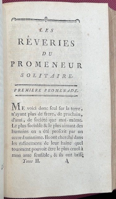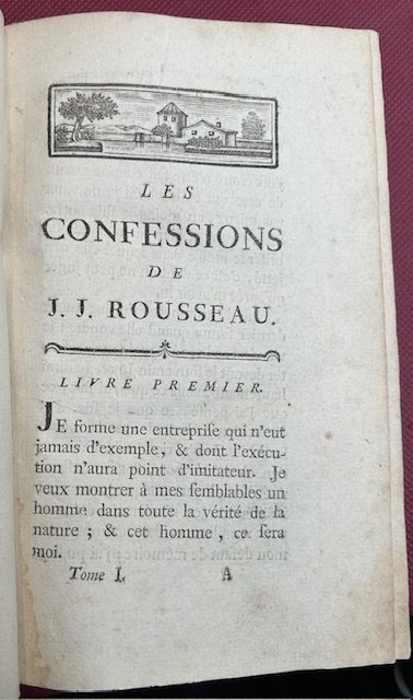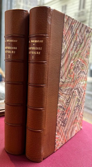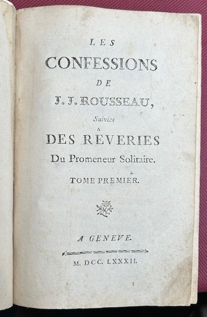2 voll. in-8 (190 x 125 mm.), pp. (4), 471; (4), 279, 300, legatura moderna in mezza pelle e piatti in carta decorata, dorso a cinque nervi, titolo in oro al dorso. EDIZIONE ORIGINALE della prima parte pubblicata a Ginevra dalla Societ° typographique de Genève; si distingue da una variante ornamentale ai frontespizi, il primo ha come marca tipografica un fiore, il secondo un'urna stile impero. Le Confessioni sono state oggetto di diverse controversie riguardo alla sua edizione originale, essendone apparse pi edizioni nel medesimo anno. Infatti questa apparve nell'aprile 1782 e a maggio c'erano gi diverse copie pirata in vari formati. L'edizione in oggetto, chiamata 'en gros caracteres' da considerarsi la prima assoluta secondo una recente ricerca basata sui commenti pubblicati nel numero di giugno 1782 del Journal Helvetique. La seconda parte di questa edizione apparve nel 1789, con i volumi III e IV e con il titolo 'Seconda parte delle confessioni' comprendenti i libri 7-12. Essi dovevano rimanere inediti fino al secolo successivo, ma uno degli esecutori testamentari vendette il manoscritto per la pubblicazione a un altro editore nel 1789. Lo testimonia l'amico ed editore di Rousseau, Pierre Alexandre du Peyrou, il quale afferm: 'en violation de la volont de l'auteur, suivant laquelle cet ouvrage [la seconde partie] ne devait voir le jour qu'au commencement du sicle prochain'. Dufour 340; Tchemerzine V , 562.