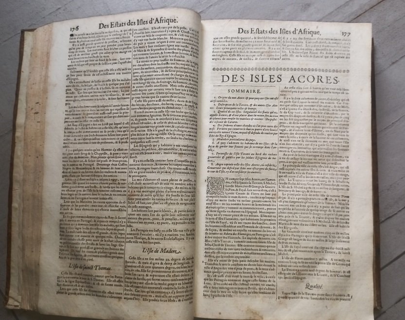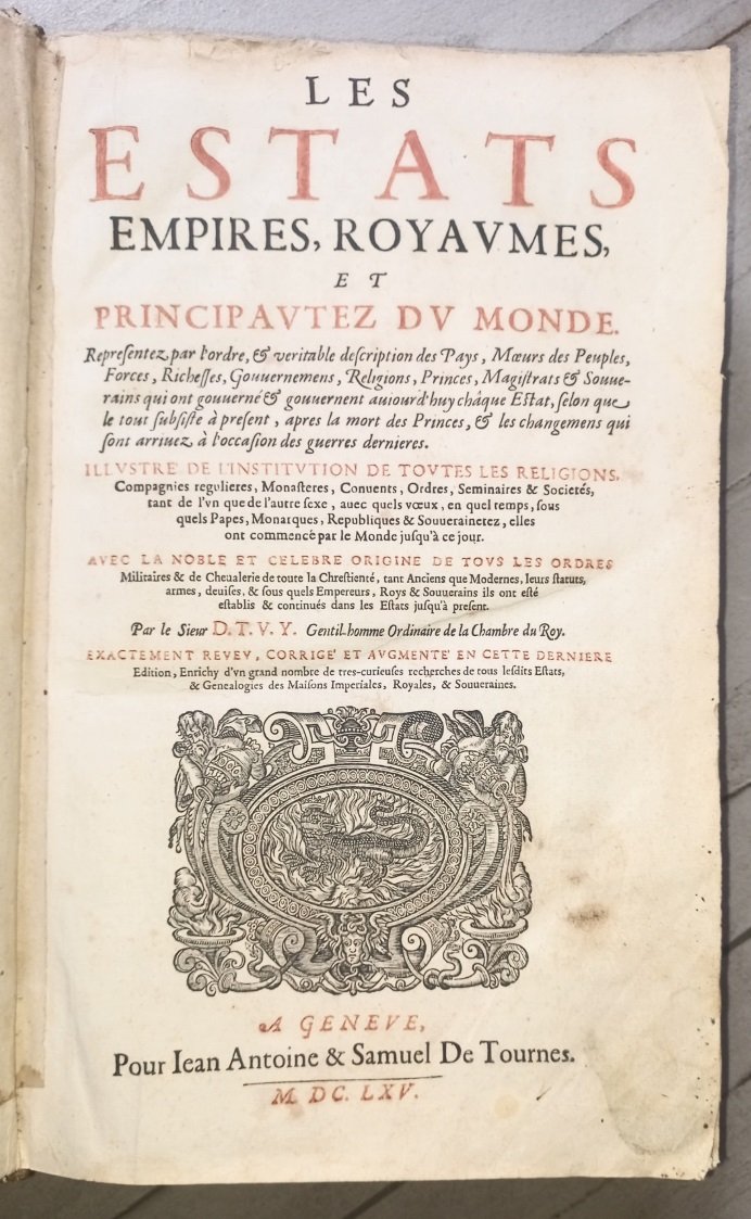 >in-folio, ff. (4), pp. 930, ff. (14), leg. coeva in p. pergamena dipinta ad imitazione pelle maculata, titolo e fregi in oro al dorso, frontespizio in rosso e nero con grande impresa tipografica, testo su due colonne. L'edizione originale è datata 1614, il libro è stato davvero un grande successo ed è stato ristampato più volte fino alla fine del XVII. Opera storico-descrittiva di notevole importanza per la quantità di notizie riguardanti tutti gli Stati del mondo allora vigenti, la storia delle guerre e delle conquiste coloniali. Particolarmente interessanti i passi sulla storia, gli usi ed i costumi di certi paesi del nuovo mondo (Messico, Brasile, Perù le isole dei Caraibi), della Cina, del Giappone e dell'Africa (Egitto, Tunisia, Marocco, ecc.) Esemplare completo, difetti al foglio di titolo, margine superiore bianco delle prime 10 pag con mancanze, antico rinforzo al margine interno dell'occhietto, qualche lieve brunitura. Barbier, II, 303. Quérand, Suerchieries littér., I, 989. Graesse, II, 342.