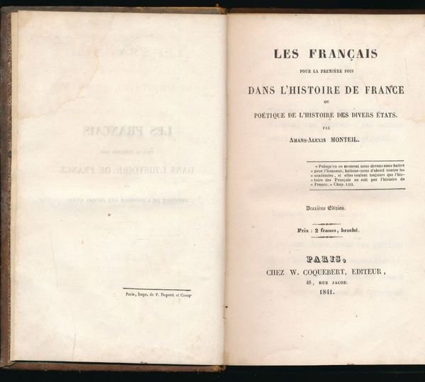 Coquebert 1841 Paris, chez W. Coquebert, 1841. In-12 relié pleine basane brune, dos lisse à filets et fleurons dorés, pièce de titre rouge, guirande dorée en encadrement sur les plats. 252 pages. Reliure frottée, traces pâles d'humidité, une page partiellement détachée. Bon exemplaire malgré les défauts signalés. Peu courant.
