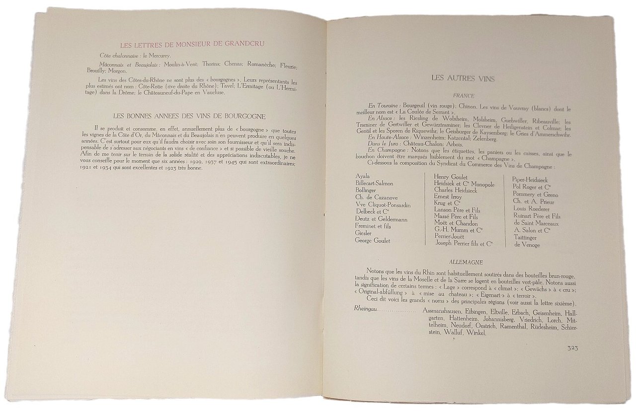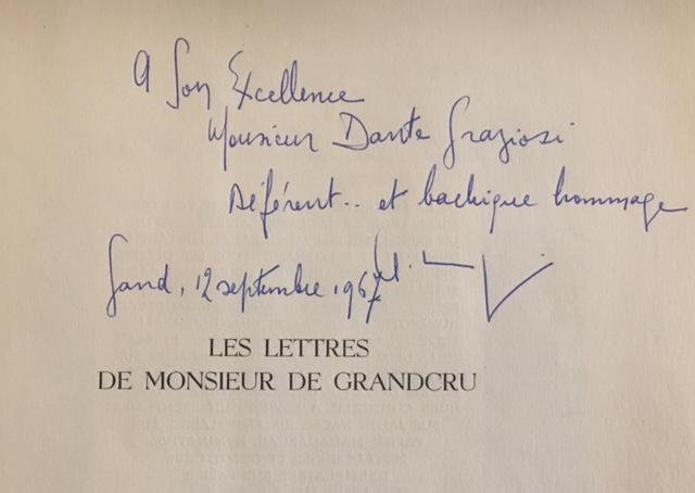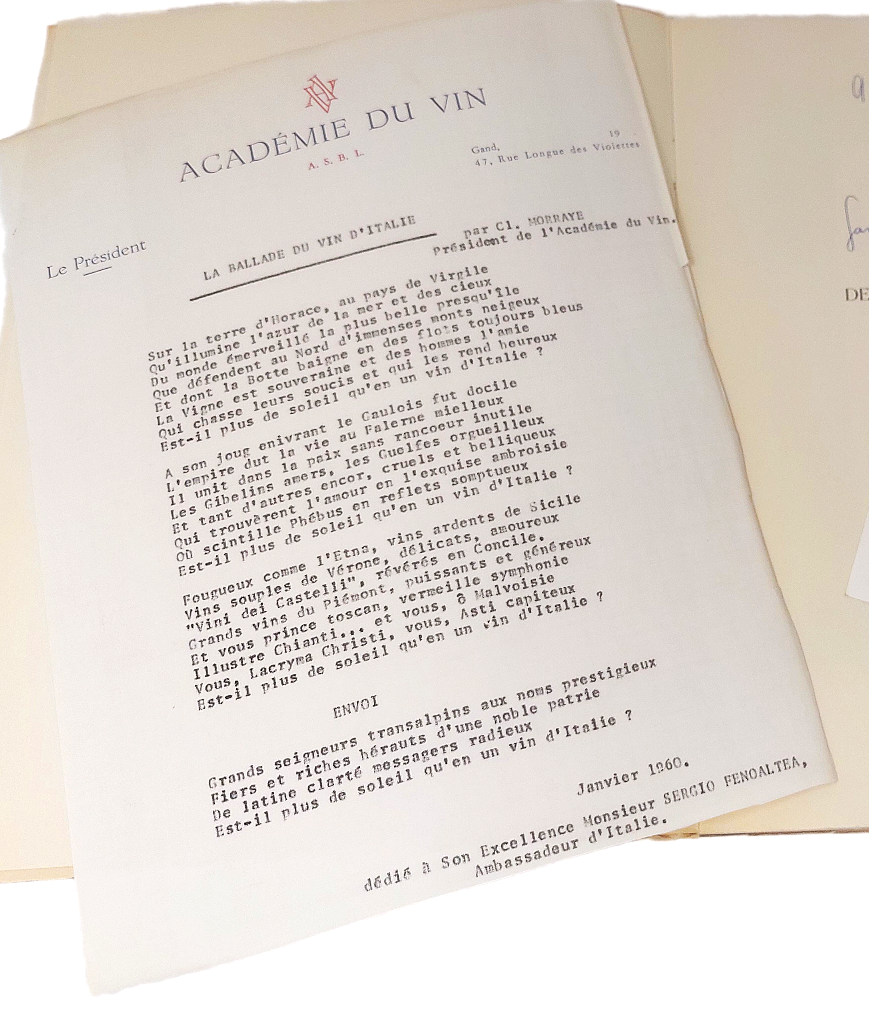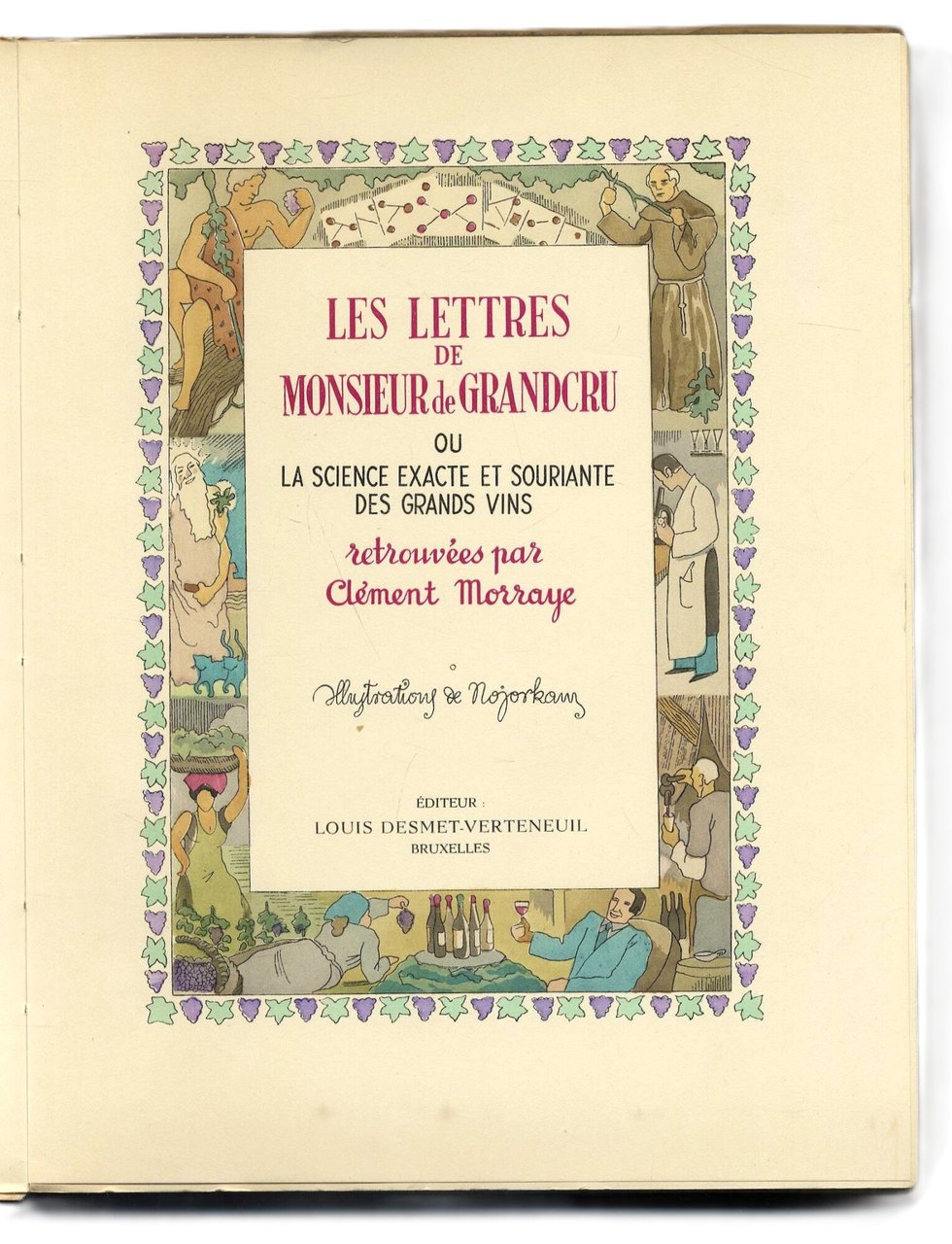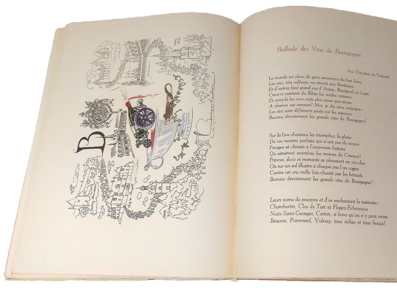 >in-4, pp. 332, broch edit. Titolo incorniciato da personaggi impegnati nella preparazione del vino, tavole a piena pagina colorate (tra cui diverse mappe dei vini di Francia), le illustrazioni sono di Norbert Schepens, detto Nojorkam (1911-2003), pittore e disegnatore belga. Edizione originale, in tiratura limitata, esemplare 2300/1924. In fine, elenco dei vini francesi, e menzione di alcuni rinomati vini Europei divisi per nazione. All'occhietto la dedica ms. dell'autore a Monsignor Dante Graziosi datata 12 Septembre 1967. Allegati al volume: un biglietto da visita di Clément Morraye Consul D'Italie con 11 righe ms di ringraziamento per l'aiuto ricevuto per la partecipazione alla fiera Internazionale del 1967; ed una lettera (Janvier 1960) su carta intestata de "L' Académie du vin" contenente una ballata dattiloscritta di Morraye (all'epoca, Président de l'Académie du Vin), intitolata "La Ballade du vin d'Italie" dedicata a Monsieur Sergio Fenoaltea: "fougueux comme lì Etna, vins ardents de Sicilie-Vins souples de Vérone. délicats, amoureux -"vini dei Castelli", rèvérés en Concile. Grand Vins du Piémont, puissants et généreux-Et vous prince toscan..." Bell'esemplare, in perfetto stato di conservazione.