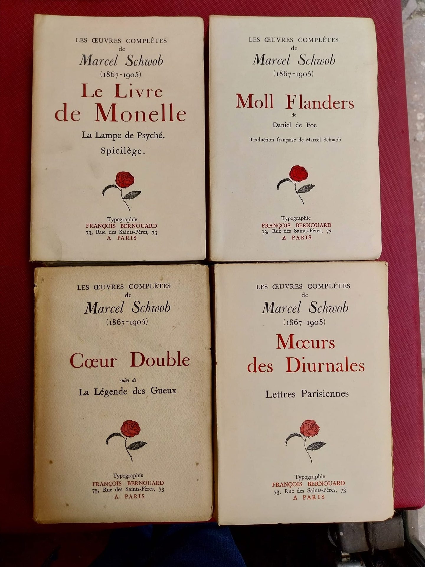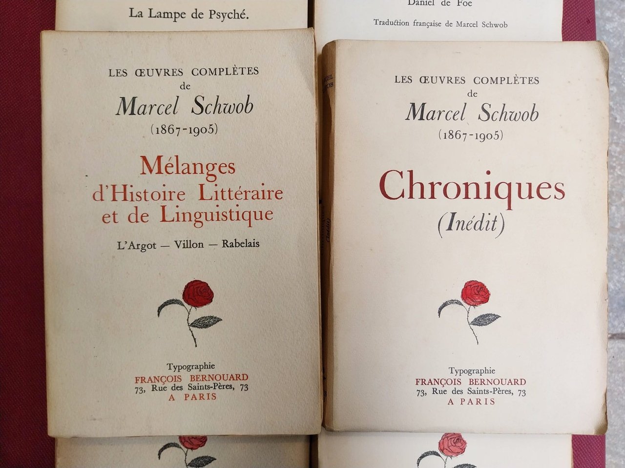 10 voll. in-8° in brossure editoriali, tiratura limitata a 1500 esemplari, varie numerazioni. Buoni esemplari, in barbe. Di seguito l'elenco delle opere: Vies Imaginaires, suives du Roi au Masque d'aOr. Pp. 200, 174. Moll Flanders de Daniel De Foe. Traduction francaise de Marcel Schwob. Pp. 398. Chroniques (Inedit). Pp. 272. Melanges d'Histoire Litteraire et de Linguistique. L'Argot - Villon - Rabelais. Pp. 377. Le Livres de Monelle. La Lampoe de Psychè. Spicilege. Pp. 184; 202. Ecrits de Jeunesse. (Essais inedits). Precedes de sa Vie et d'une Bibliographie par M. Pierre Champion. Pp. LXIII, 270. Derniers Ecrits. Lettres a sa Famille. Voyage a Samoa. Preface de Pierre Champion. Pp. 308. Moeurs des Diurnales. Lettres Parisiennes. Pp. 166. Theatre. Macbeth - Historie d'Hamlet - Francesca da Rimini. Pp. 94, XXVI, 187; XXVII, 88. Coeur Double. Suivi La Legende des Gueux. Pp. XX, 262.