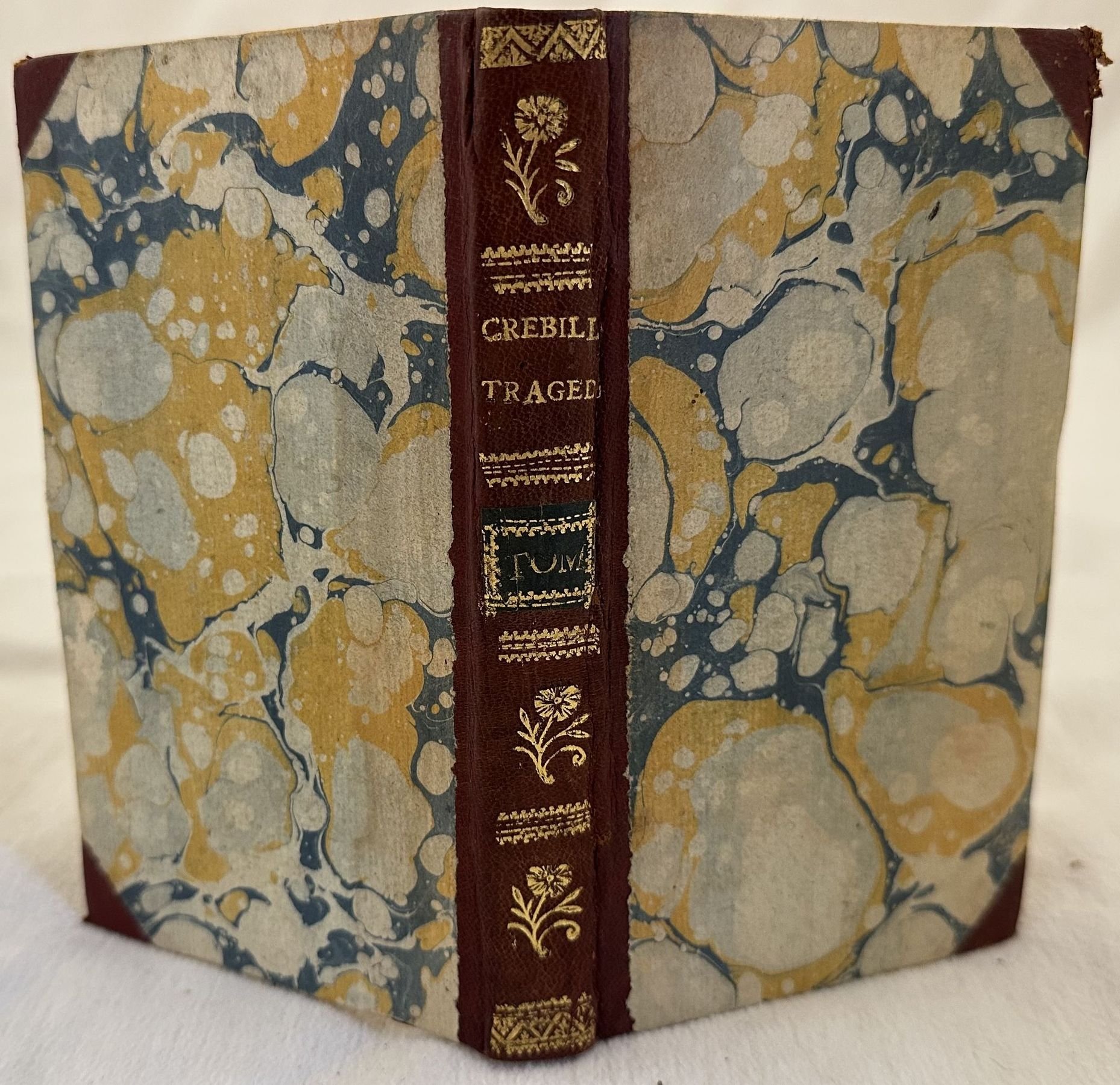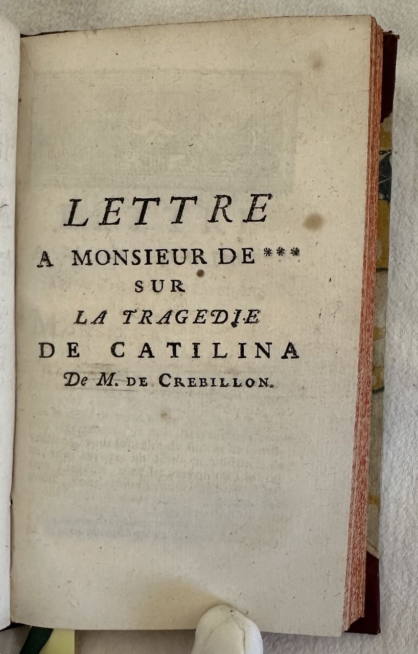 Edizione del 1749 di questo volume con opere teatrali di Prosper Jolyot de Crebillon (1674-1762) poeta e drammaturgo francese. Siamo in possesso del tomo terzo solamente contenente Catlina; Lettre a Monsieur de . sur la tragedie de Catilina de M. de Crebillon; Xerces; Lettre critique a Monsieur de . sur Rhadamisthe et Zenobie. In ottime condizioni. Copertina in mezza pelle con titolo e decorazioni in oro al dorso in ottime condizioni con lievi usure ai margini e dorso. Legatura in buone condizioni. Pagine in ottime condizioni con rare fioriture. In 16. Dim. 16,5x9,5 cm. Pp. (6)+265-349+185. Edition of 1749 of this volume with theatre works by Prosper Jolyot de Crebillon (1674-1762) french poet and drama writer. We only have the third tome probably containing Catlina; Lettre a Monsieur de . sur la tragedie de Catilina de M. de Crebillon; Xerces; Lettre critique a Monsieur de . sur Rhadamisthe et Zenobie. In very good conditions. Half leather coeval cover with gilted title and decorations in the spine in very good conditions. Binding in good conditions. Inside pages are in very good conditions with occasional foxing. In 16. Dim. 16,5x9,5 cm. Pp. (6)+265-349+185. <BR><BR>