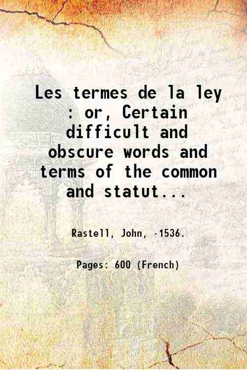 Les termes de la ley : or, Certain difficult and obscure words and terms of the common and statute laws of this realm, now in use, expounded and explained. Corrected and enlarged, with the addition of many other words; particularly of those that have been lately introduced into the statute law of Great Britain, never printed in any other impression 1721