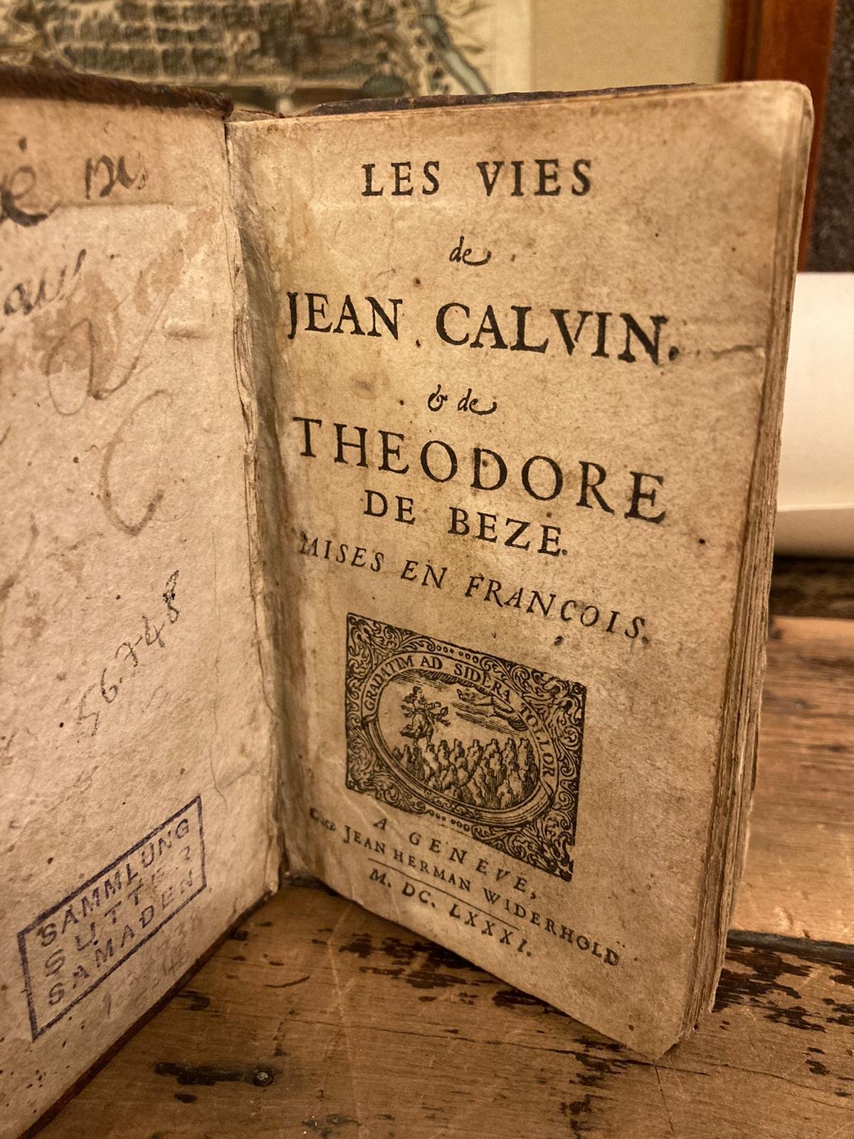 In-12° (14x9 cm), piena pelle testa di moro muta coeva, con dorso a quattro nervi rinforzato. Pp (16), 1-190; (2), 191-303, (3), impresa dello stampatore al frontespizio, due antiporte figurate coi ritratti dei teologi (rami incisi da J. C. Böcklin), testate e capolèttere silografici. Timbro ex libris e segni di appartenenza al contropiatto anteriore. Minimi difetti ai contropiatti, sguardia anteriore non presente, abrasione con piccola perdita testuale alla seconda carta non numerata, minima galleria tarlacea al taglio di piede. Nel complesso buon esemplare. Edizione originale in lingua francese delle vite dei due teologi originariamente scritte in lingua latina. Ad essere precisi, come viene ricordato nell'introduzione, Theodore de Beze (1519-1605), che prese il posto di Calvino alla morte di questi, aveva lui stesso approntato una traduzione in lingua francese della vita del teologo svizzero emendata e trasformata nella presente edizione. Antoine del La Faye fu professore al Collège di Ginevra (1561-74), nel 1574 conseguì il dottorato in medicina in Italia, dal 1578 al 1580 fu titolare della cattedra di filosofia grazie all'intervento di Teodoro di Beza che nel 1586 accompagnò al colloquio di Montbéliard. Le sue opere teologiche consistono per lo più in raccolte di tesi. Tradusse in francese la Storia di Roma di Tito Livio e la Storia dei Giudei di Giuseppe Flavio e pubblicò diversi commenti biblici. Il Consiglio ginevrino censurò alcuni passaggi della sua biografia di Teodoro di Beza (1606).