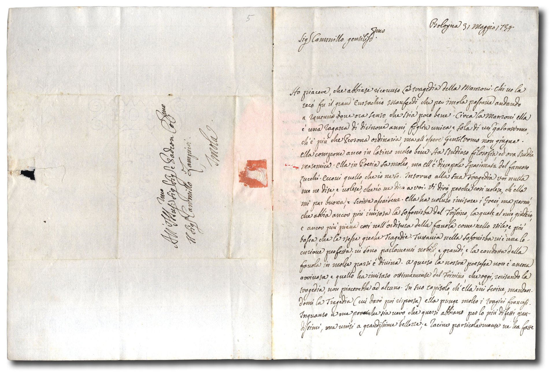 >2 pp. in-8 grande fittamente vergate e firmate da Zanotti, indirizzo autografo in quarta pagina. Lo scrittore fornisce al suo corrispondente una vivace carrellata delle opinioni che ha su alcuni letterati bolognesi. ''Ho piacere, che abbiate ricevuto la tragedia della Manzoni. Chi ve la recò fu il grand Eustachio Manfredi, che per Imola passava andando a Ravenna, dove ora penso, che stia poco bene. Cira la Manzoni, ella è una ragazza di diciannove anni, figlia unica, e sola di un galantuomo, ch'è più che Persona ordinaria, ma all'essere Galantuomo non giunge..''. ZANOTTI, Giampietro (Parigi 1674- Bologna 1765), pittore e poeta.