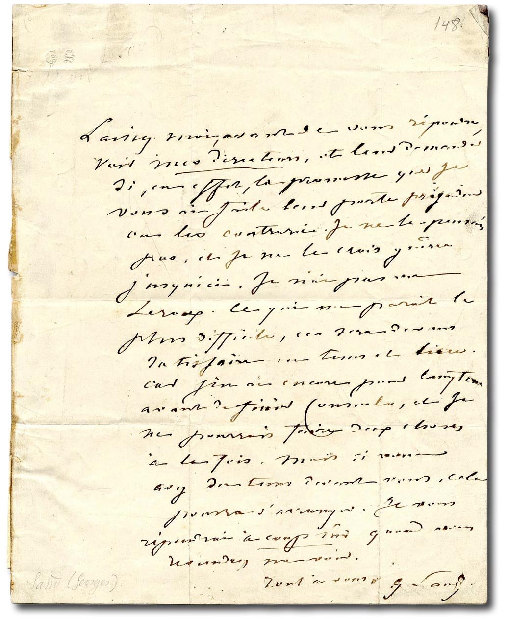 >1 pagina in-8 su carta con iniziali ''GS'' impresse a secco, indirizzo ''Monsieur G. Falempin, rue d'Autin 14'', sigilli parzialmente conservati. Lettera in cui la scrittrice gli dice che dovrà confrontarsi con i suoi editori per capire se ''la promesse que je vous ai faite leur porte prejudice ou les contraire''. Dice che però che la parte che le sembra più difficile ''sera de vous satisfaire en temps et lieu car j'en ai encore pour longtemps avant de finir Conuelo, et je ne pourrais faire deux choses à la fois''. Consuelo è un romanzo pubblicato a puntate fra il 1842 e il 1843 e questo permette di collocare la missiva intorno a quegli anni. Falampin fu uno dei fondatori de ''L'Illustration'' e uomo d'affari George Sand tra 1841-1852, anche se la irritò spesso per la sua negligenza e lentezza nel rispondere. Buon esemplare.