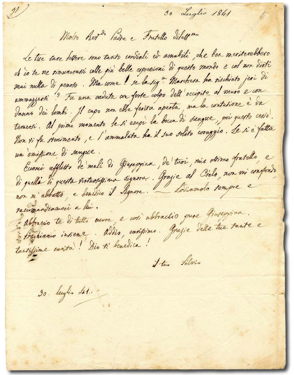 >1 pagina in-4, in cui Pellico descrive nel dettaglio al padre e al fratello una brutta caduta della Marchesa di Barolo. Dalla missiva si evince lo stretto legame che legò Pellico e Juliette Colbert: un'amicizia fedele e profonda rinsaldata nel tempo da una strettissima comunanza di ideali e da un proficuo rapporto di collaborazione. ''...la signora Marchesa ha rischiato ieri di ammazzarsi... fu una caduta con forte colpo dell'occipite al muro e con danno dei lombi... ''. Giulia di Barolo fu celebre filantropa e serva di Dio.