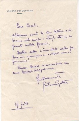 - 211x133 mm. 1 carta (scritto il recto). Manoscritto a penna blu su carta intestata "Camera dei Deputati".