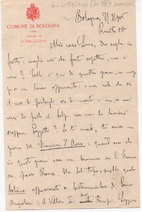 - 215x135 mm. 1 bifolio, scritte 4 pagine. Manoscritto a inchiostro nero su carta intestata "Comune di Bologna / Ufficio VII / Istruzione".