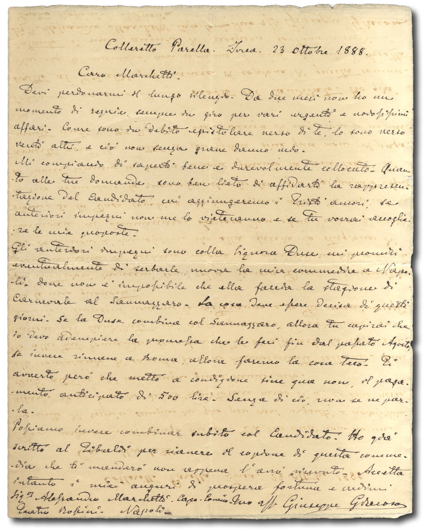 >1 pagina in-4 (275x220 mm) vergata da Giacosa in chiara ed elegante grafia e indirizzata ad Alessandro Marchetti, capocomico al Teatro Rossini di Napoli. Lo scrittore piemontese vorrebbe affidare a quest'ultimo il suo libretto ''Il Candidato'': “sono ben lieto di affidarti la rappresentazione del Candidato, cui aggiungeremo i Tristi amori”. Si scusa anche per il ritardo nella risposta ma dice di essere stato molto impegnato. Giacosa ricorda inoltre all'amico la promessa fatta a Eleonora Duse di serbarle una nuova commedia per Napoli. ''La cosa deve essere decisa in questi giorni. Se la Duse combina col Sannazaro, allora tu capirai che devo adempiere alla promessa che le feci sin dal passato agosto, se invece rimane a Roma, allora faremo la cosa teco. Ti avverto però che metto a condizione sine qua non il pagamento anticipato di 500 lire. Senza di ciò, non se ne parla''. Maria Ida Biggi, Lettere di Eleonora Duse a Giuseppe e Teresa Giacosa, «Drammaturgia», XV, 5, 2018, pp. 207-246