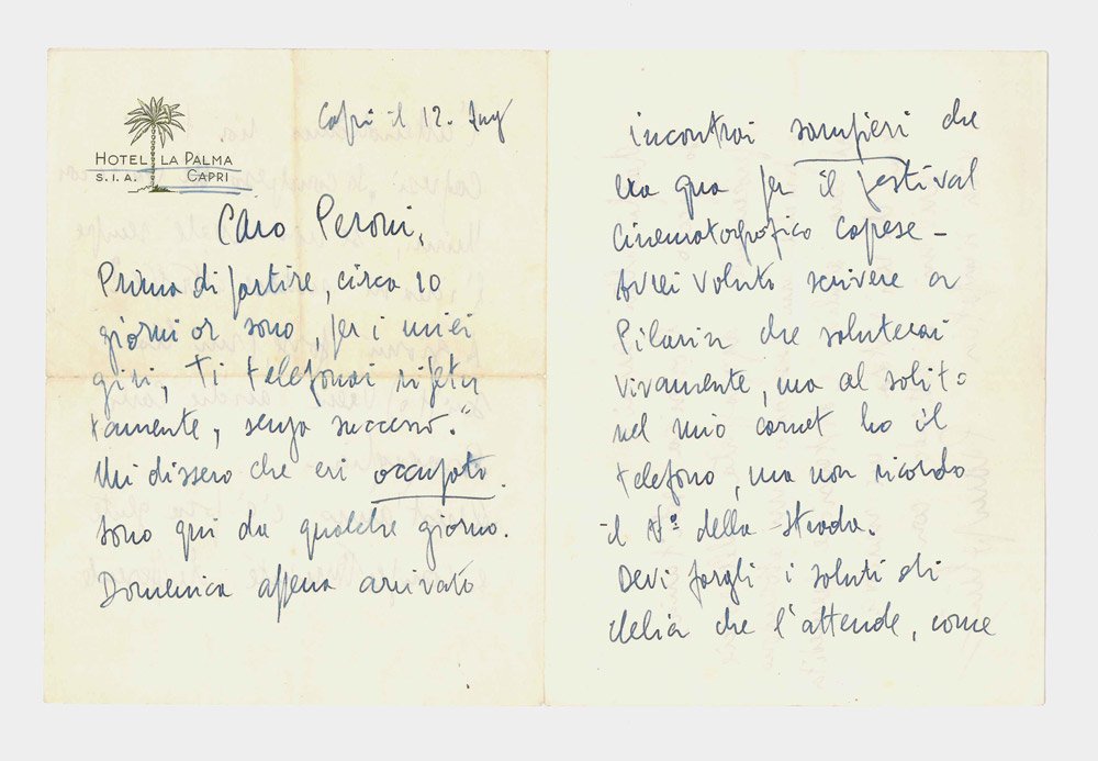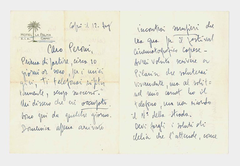 - 1 bifolio (190x145 mm chiuso) scritto su quattro pagine in inchiostro blu, su carta intestata «Hotel La Palma Capri».