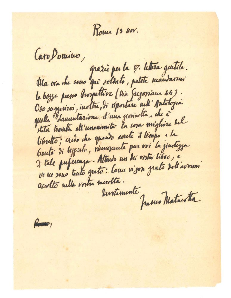 AUTOGRAFOOttimo esemplare.Franco Matacotta è stato un poeta e un giornalista; appena ventenne intrecciò una relazione con la poetessa Sibilla Aleramo, di quarant’anni più grande, e attraverso di lei ebbe modo di studiare gli inediti di Dino Campana, che con la scrittrice aveva avuto una drammatica relazione. Chiamato alle armi nel 1941 («ora che son qui soldato» dice la lettera), Matacotta si unirà in seguito alla lotta partigiana; questa esperienza gli ispirerà la raccolta di versi «Fisarmonica Rossa» (Darsena, Roma- Milano, 1945), una delle prime opere poetiche dedicate alla Resistenza. Ignazio Domino, il destinatario della lettera, è stato un poeta, curatore di antologie letterarie, in particolare: «Poesie 1940», «Poesie 1942» e «Scrittori del Piemonte» (1937). «Prospettive» era la rivista mensile diretta da Curzio Malaparte. -- «Caro Domino, grazie per la vs. lettera gentile. Ma ora che sono qui soldato, potete mandarmi le bozze presso Prospettive (via Gregoriana 44). Oso suggerirvi, inoltre, di riportare nell’Antologia quella “Lamentazione d’una giovinetta” che è stata trovata all’unanimità la cosa migliore del libretto; credo che quando avrete il tempo e la bontà di leggerlo, riconoscerete pur voi la giustezza di tale preferenza. Attendo un dei vostri libri, e ve ne sono grato: come vi son grato dell’avermi accolto nella vostra raccolta [.]».