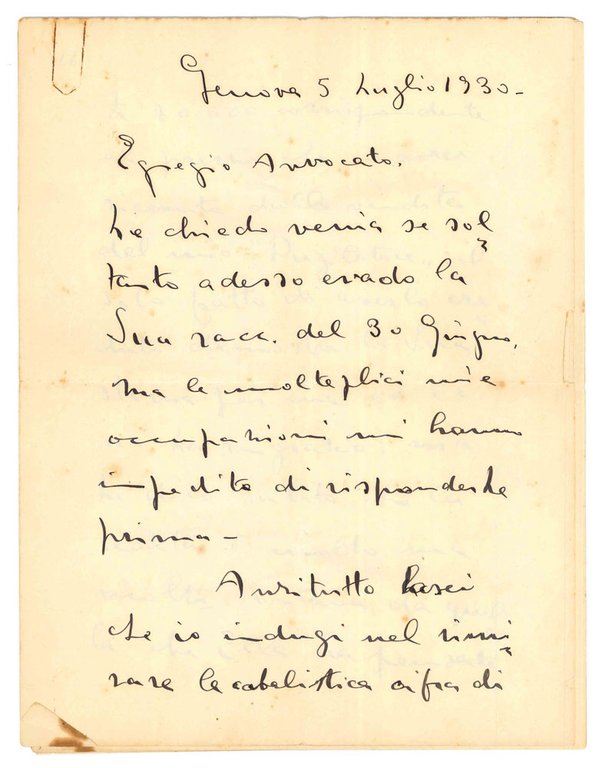 Lettera autografa firmata, inviata a un avvocato