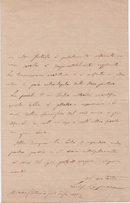 AUTOGRAFO“ […] la sua ben nota cortesia mi da coraggio a domandarle un chiarimento scientifico. […]. La sorella di un mio amico è stata domandata in isposa da un ottimo giovane il quale però ha la disgrazia di essere nato con una cattiva conformazione dei piedi, una complicazione di piede equino e di piede torto […]. Suo padre ha egualmente tale deformità […] In vista di questa trasmissione ereditaria, la famiglia del mio amico si fa un caso di coscienza del consentire ad un tal matrimonio. Ha torto? […]“. La lettera inviata fu molto probabilmente a Paolo Mantegazza, fisiologo e antropologo, assertore convinto delle teorie darwiniane.