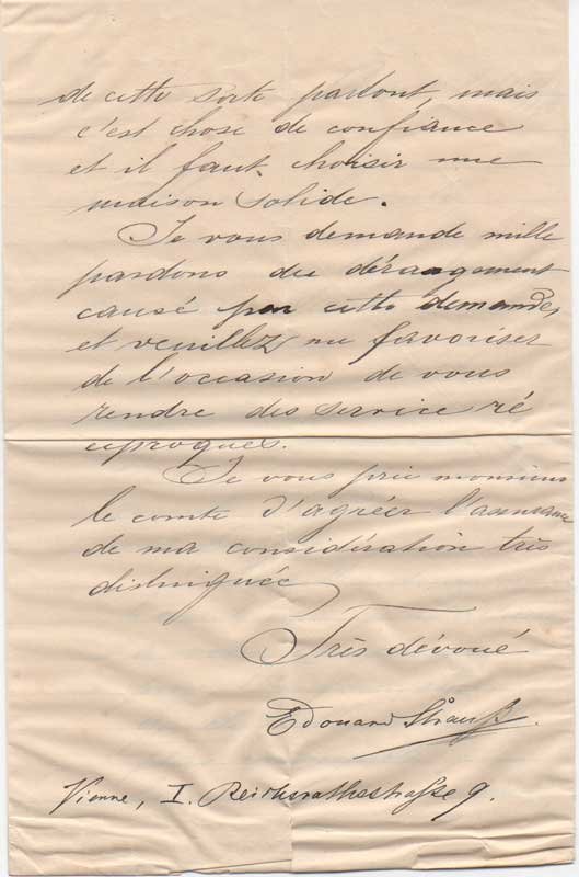 AUTOGRAFOTesto in francese su carta intestata del compositore (timbro a secco «Eduard Strauss / Kaiserl. und Koenigl. Hofballmusik-Direktor»). Alcuni brevi strappi della carta al margine inferiore della lettera. Ondulazioni della carta.In questa lettera Strauss si rivolge al Conte di San Martino a proposito di alcuni suoi concerti a Roma. Nomina il barone Marius Pasetti-Angeli von Friedenburg (1841–1913), ambasciatore austroungarico: «[.] l’Ambasciatore barone Pasetti mi indirizza a voi [.]. Si tratta dell’impresa di due o tre concerti a Roma con la mia cappella [.] per sapere quale sala sarebbe più conveniente per il concerto della mia orchestra (42 musici). Vorrei inoltre essere informato del prezzo dei biglietti, poltrone ecc., quale incasso lordo si può avere per ciascun concerto [.] conoscere il prezzo dell’affitto, dei manifesti, annunci [.]. Vi sarei infinitamente obbligato [.] se voleste indicarmi un ufficio che si incarichi per una provvigione conveniente dell’amministrazione dei concerti a Milano, Venezia [.]».