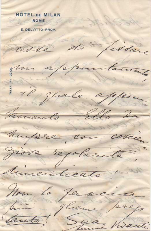 AUTOGRAFOManoscritto a inchiostro nero su carta intestata «Hotel de Milan / Rome». Ondulazioni delle carte.Annie Vivanti esprime le sue rimostranze al conte di San Martino per aver atteso inutilmente una sua visita ed aver rinunciato a vari impegni. La scrittrice vorrebbe organizzare alcuni concerti per la figlia Vivien, giovane talento del violino. Il conte di San Martino, mecenate e organizzatore di spettacoli musicali, fu anche Presidente dell’Accademia di Santa Cecilia.