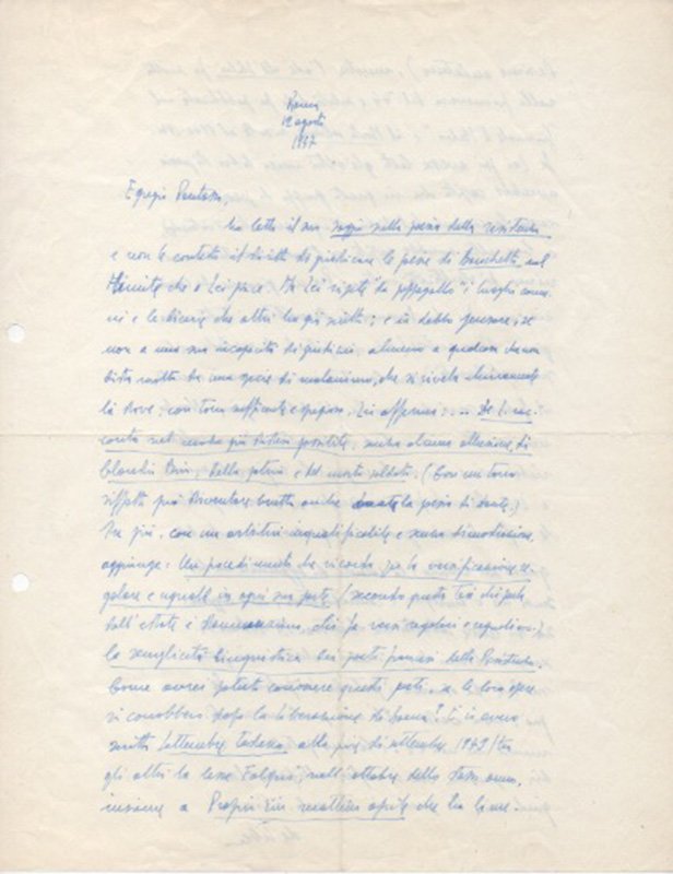 Lettera autografa firmata inviata al critico e storico della letteratura Sergio Pautasso. Datata 12 agosto 1957, Roma